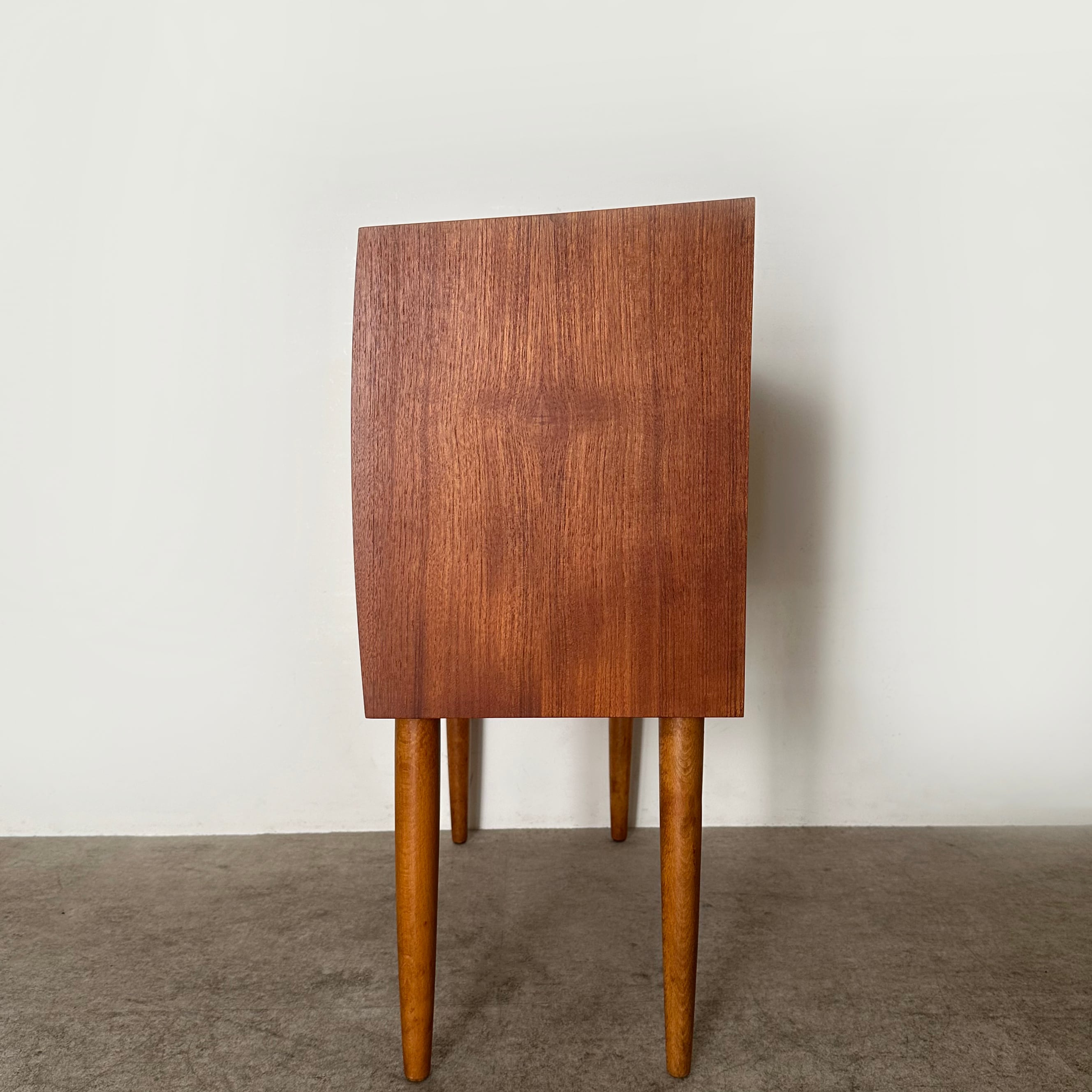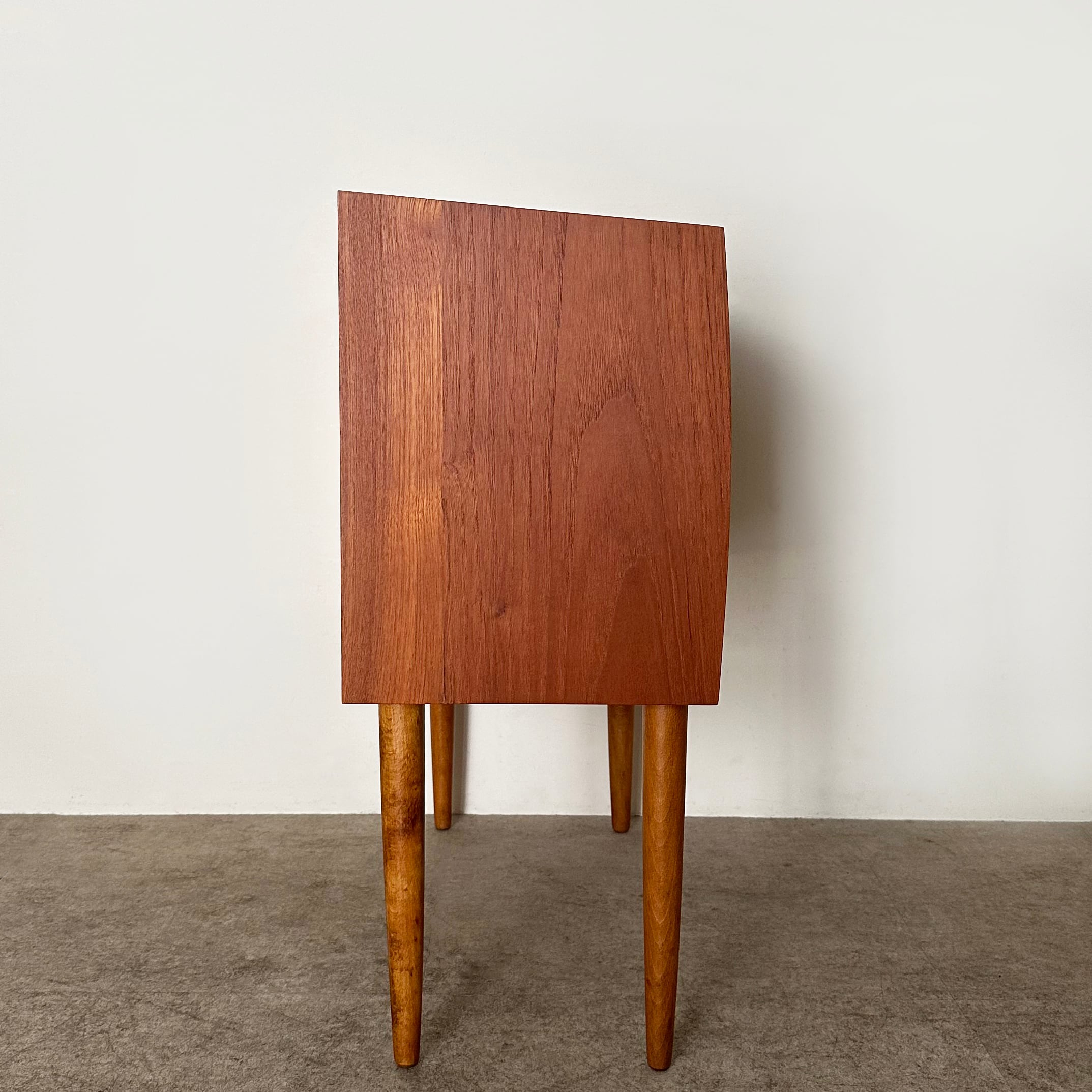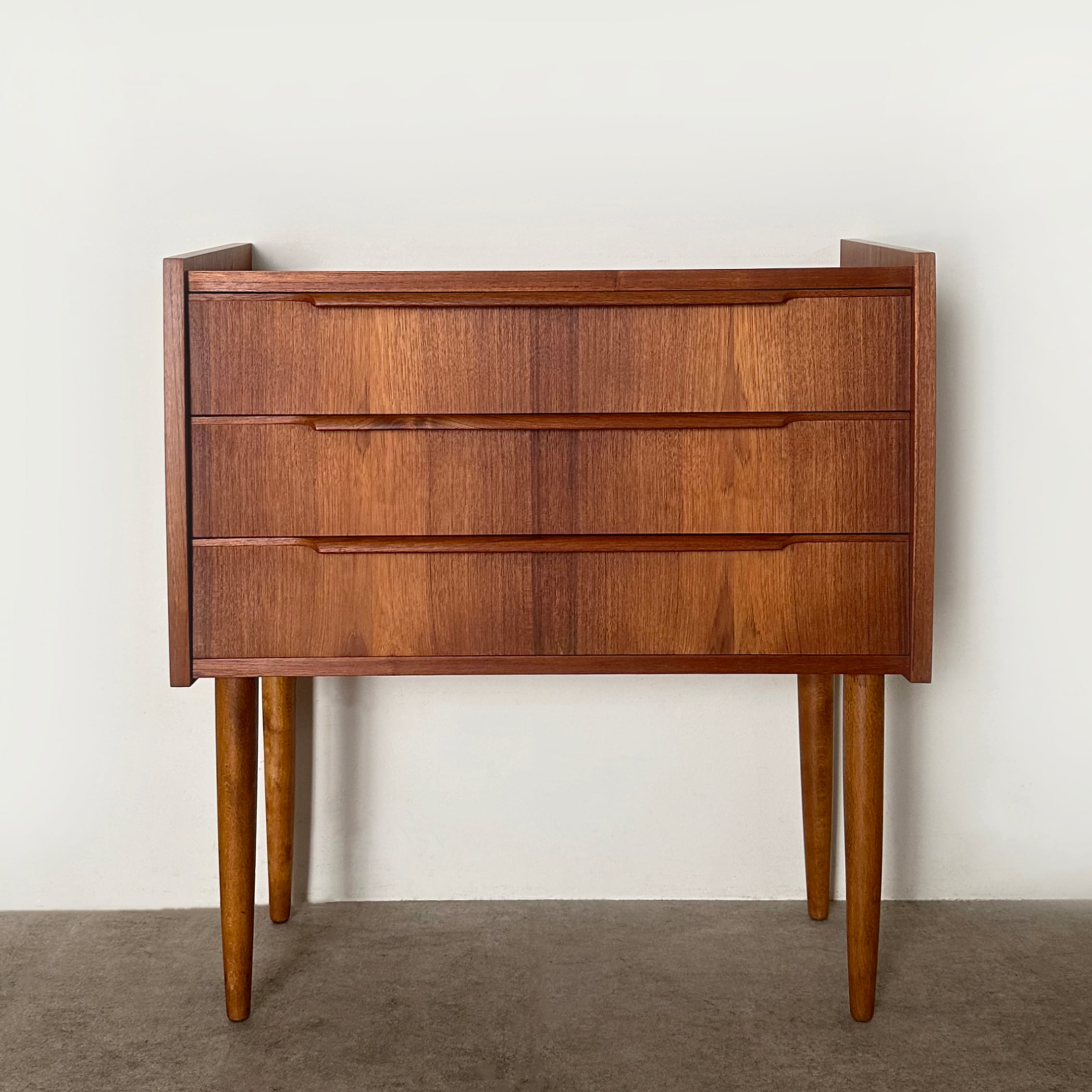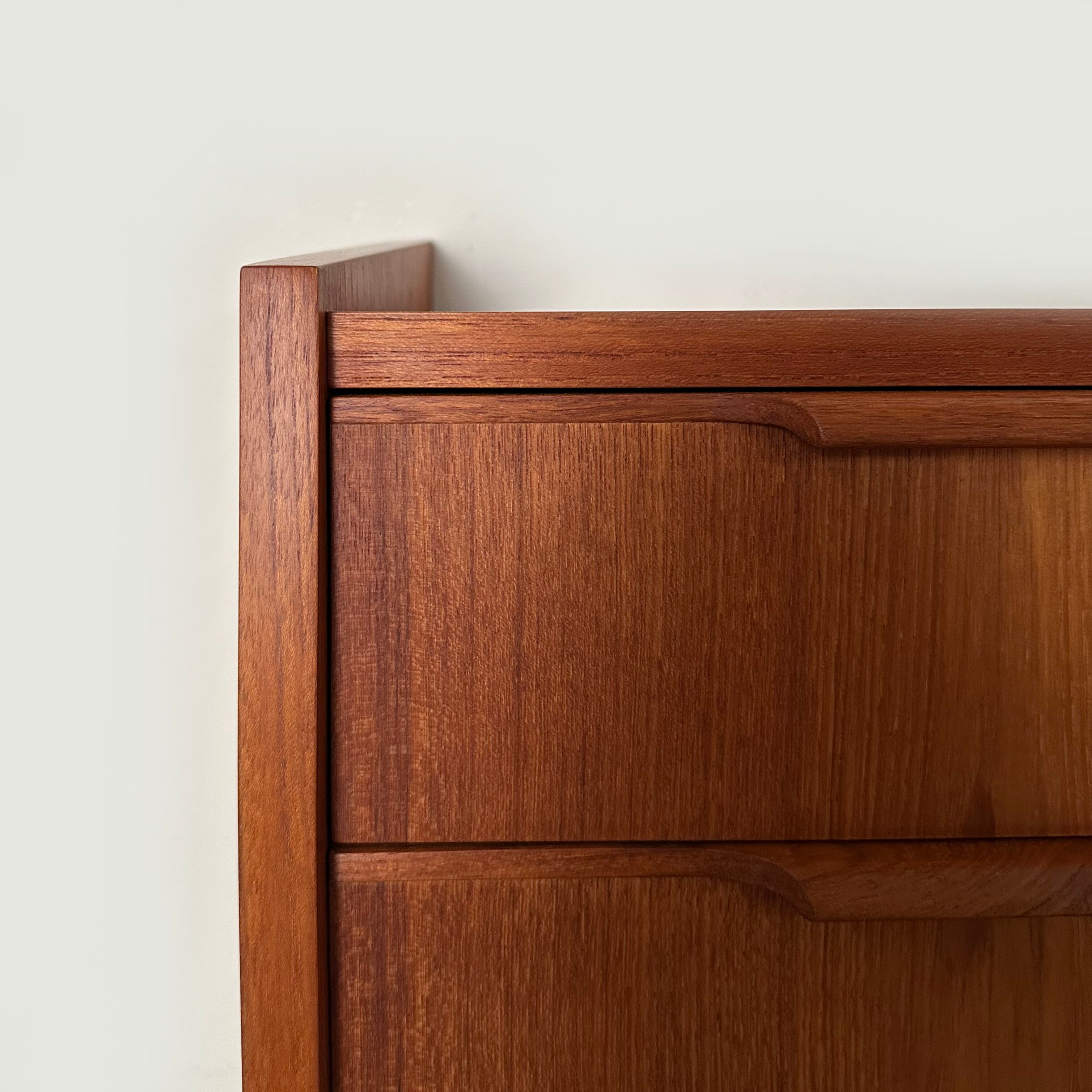 チークの無垢材を削り出して作られた取手は、この時代のデンマーク製のチェストの特徴のひとつ。横にすっと線を引いたような潔いデザインが、シンプルでありながら個性的で存在感のある佇まいをもたらしています。