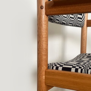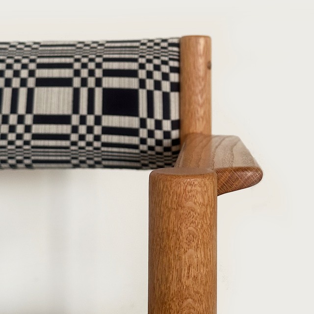・ 張り地はフィンランドを代表するテキスタイルブランド、ヨハンナ・グリクセン(Johanna Gullichsen)の代表的なデザイン、ドリス(Doris)をあわせました。白と黒のコントランストが織りなす立体感のあるグラフィカルなパターンが、シンプルなフォルムの椅子を個性的な一台へと設えています。