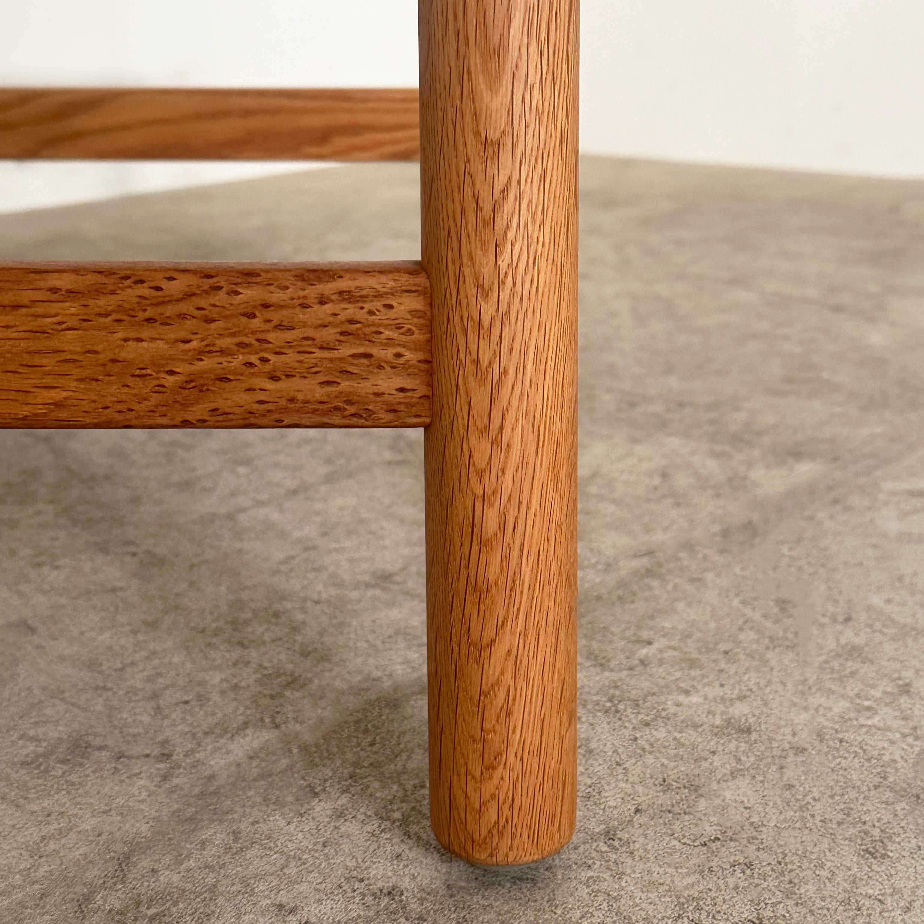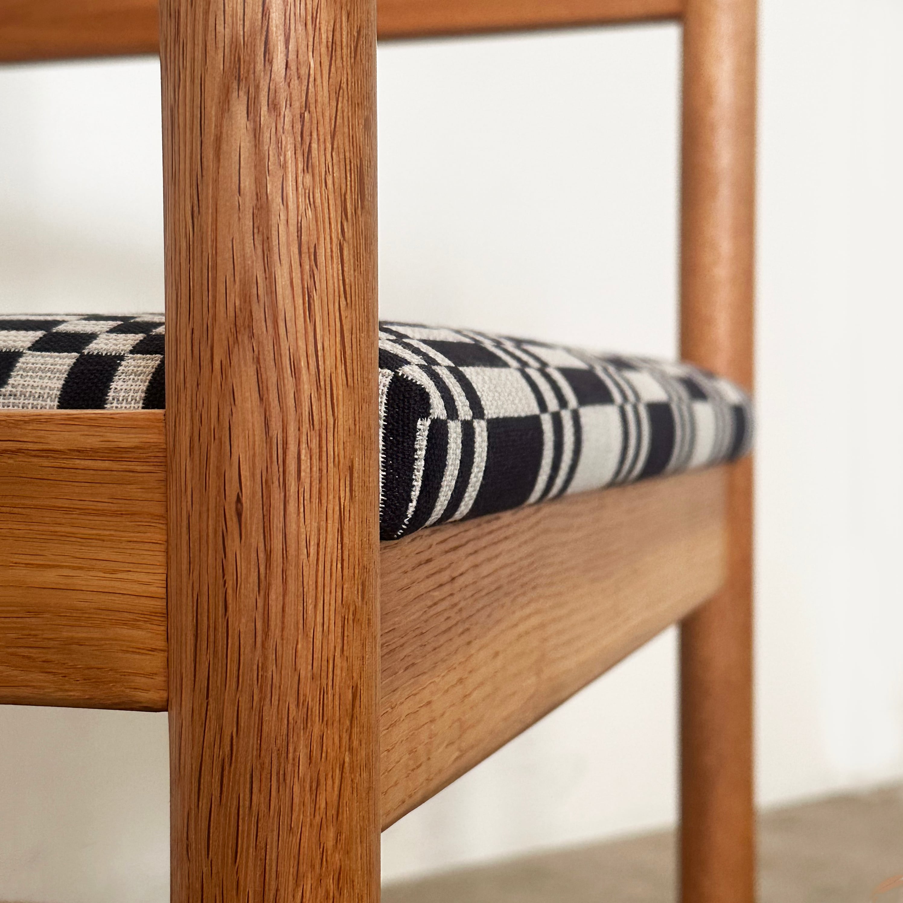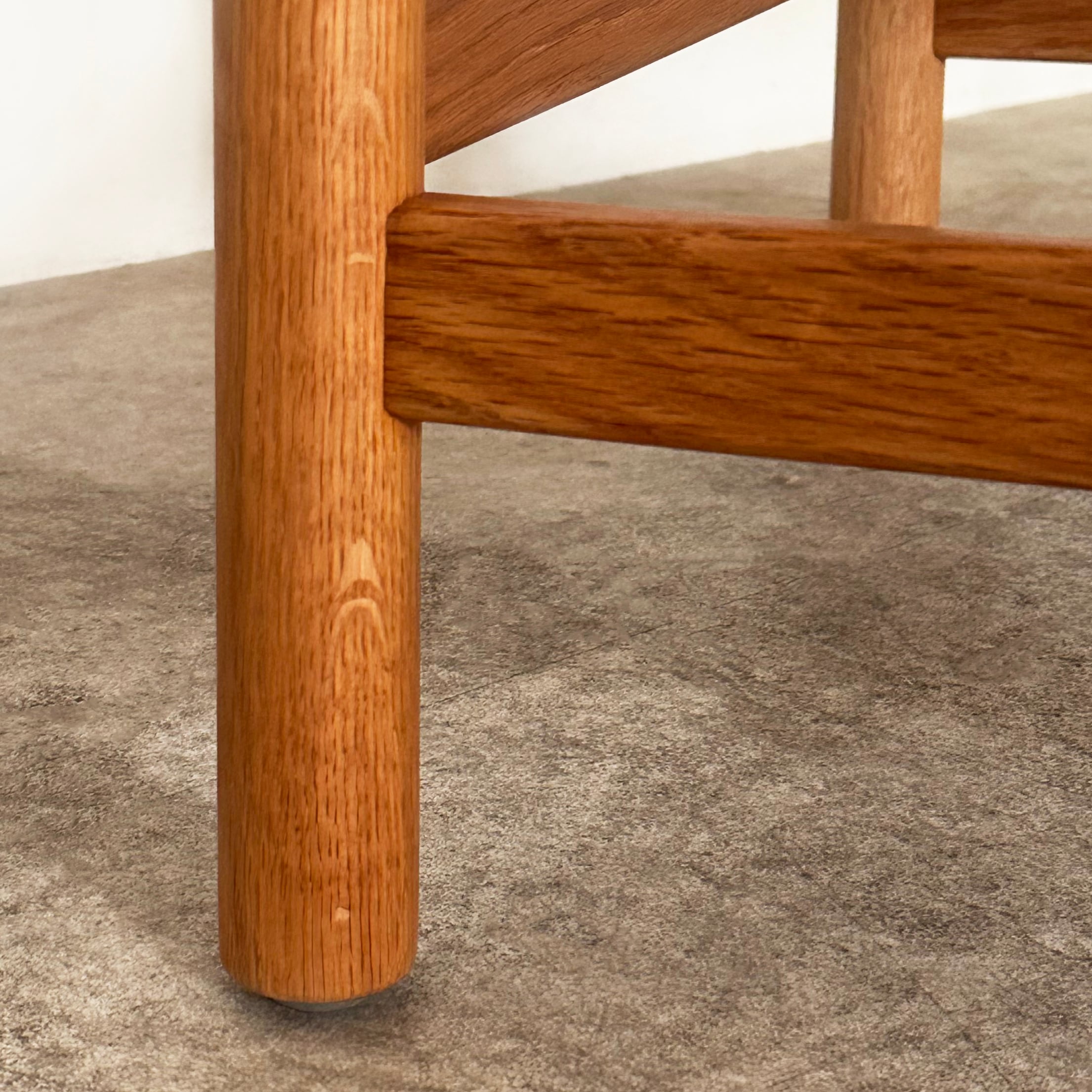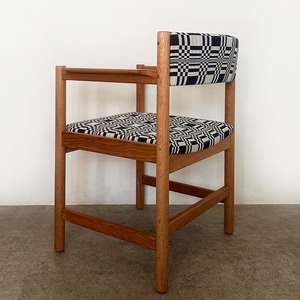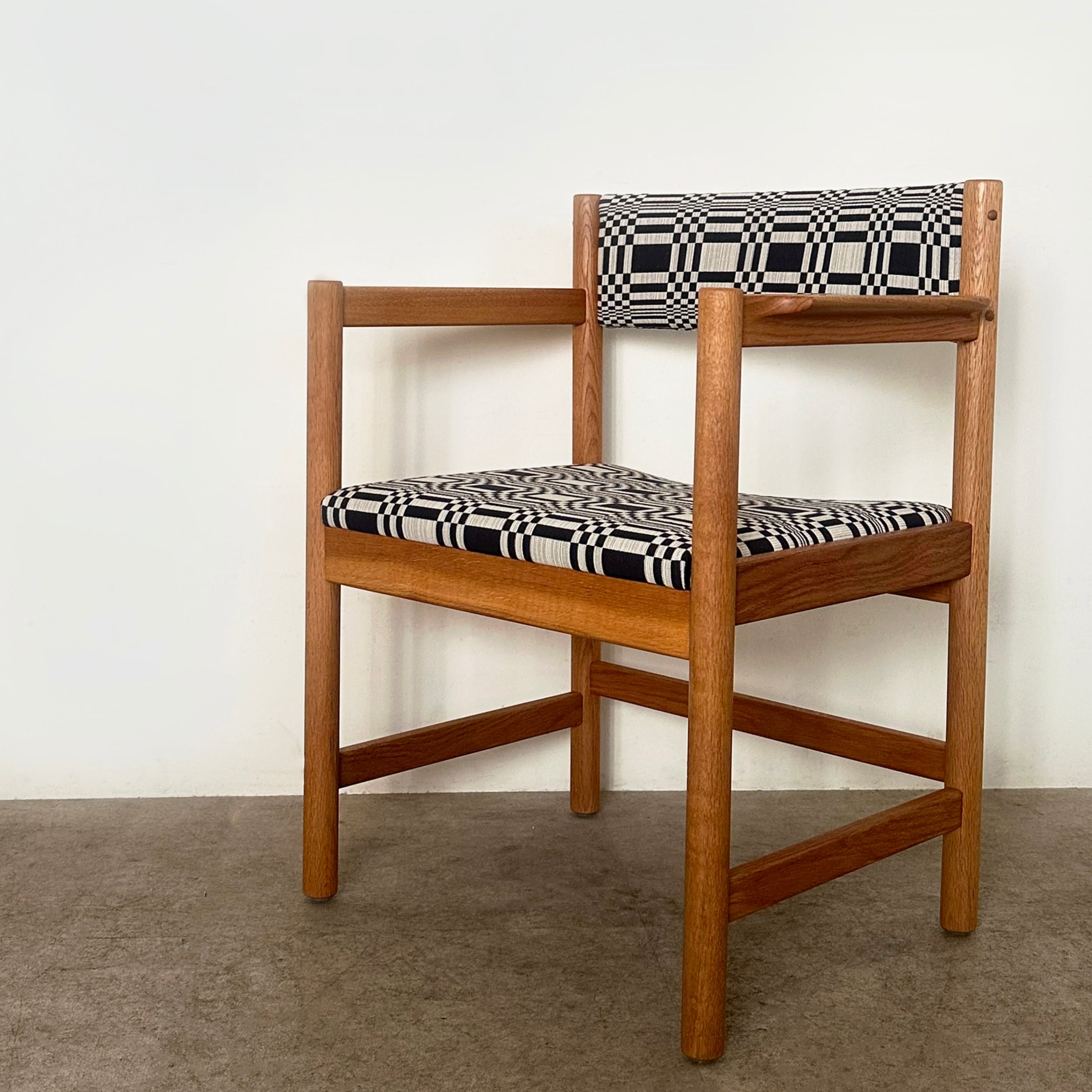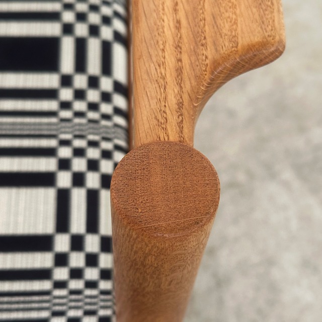 オークの無垢材で構成されたシンプルなフォルムはモーエンセンならでは。アームにはモーエンセンの代表作の一つであるスパニッシュ ダイニングチェアを思わせる意匠が施されています。実直さと素朴な温かみを感じるデザインの中にしっかりと耐久性が考慮されているのもモーエンセンの椅子の特徴の一つ。長い年月を経た今もなお十分な機能性を保っています。それぞれのパーツがほぼ直角で構成されているのでかっちりとした印象ですが、背もたれの緩やかなカーブが腰掛けた時に背中をしっかりと支え、アームは自然と肘がかかるように設計されているので、長い時間でも心地よく座ることができます。