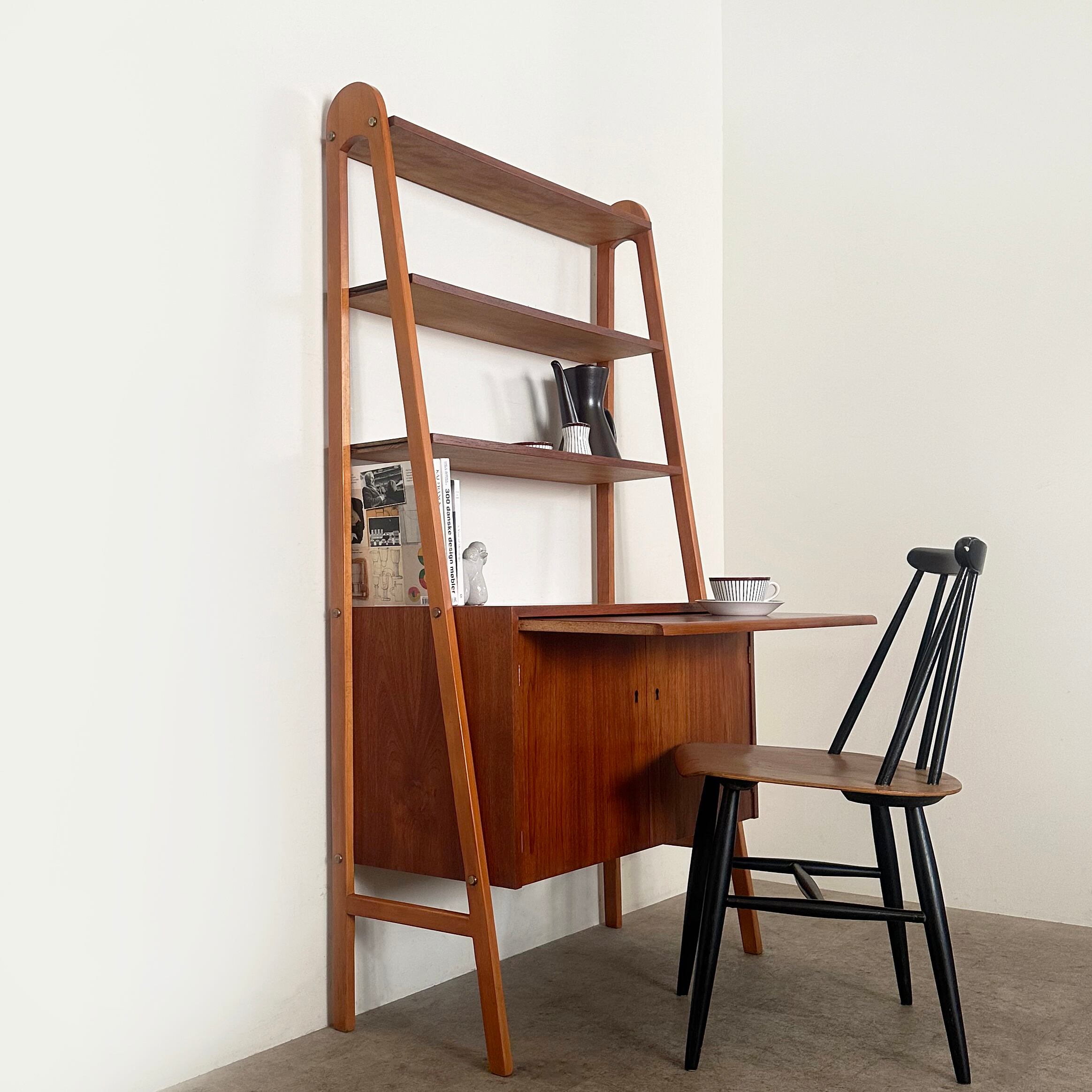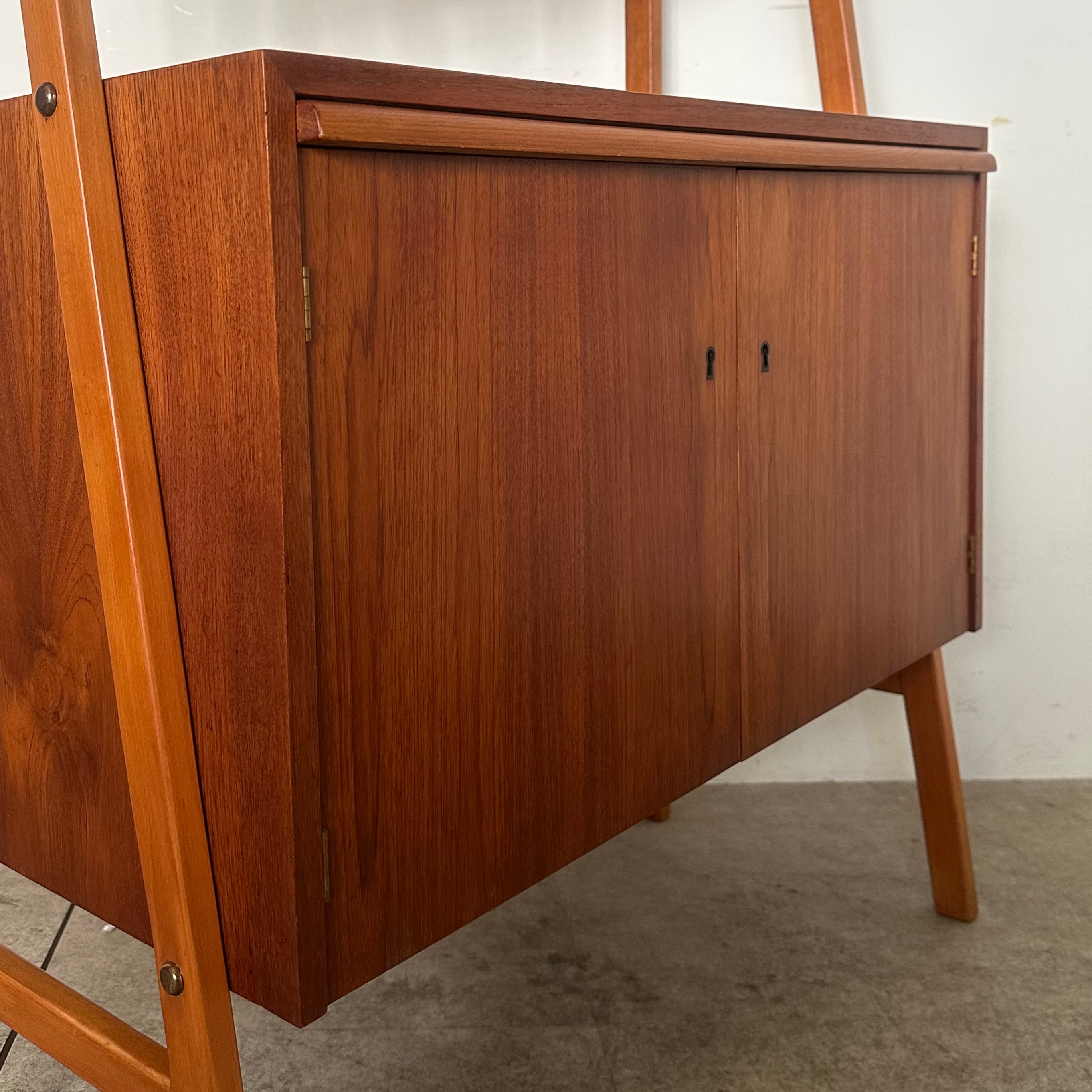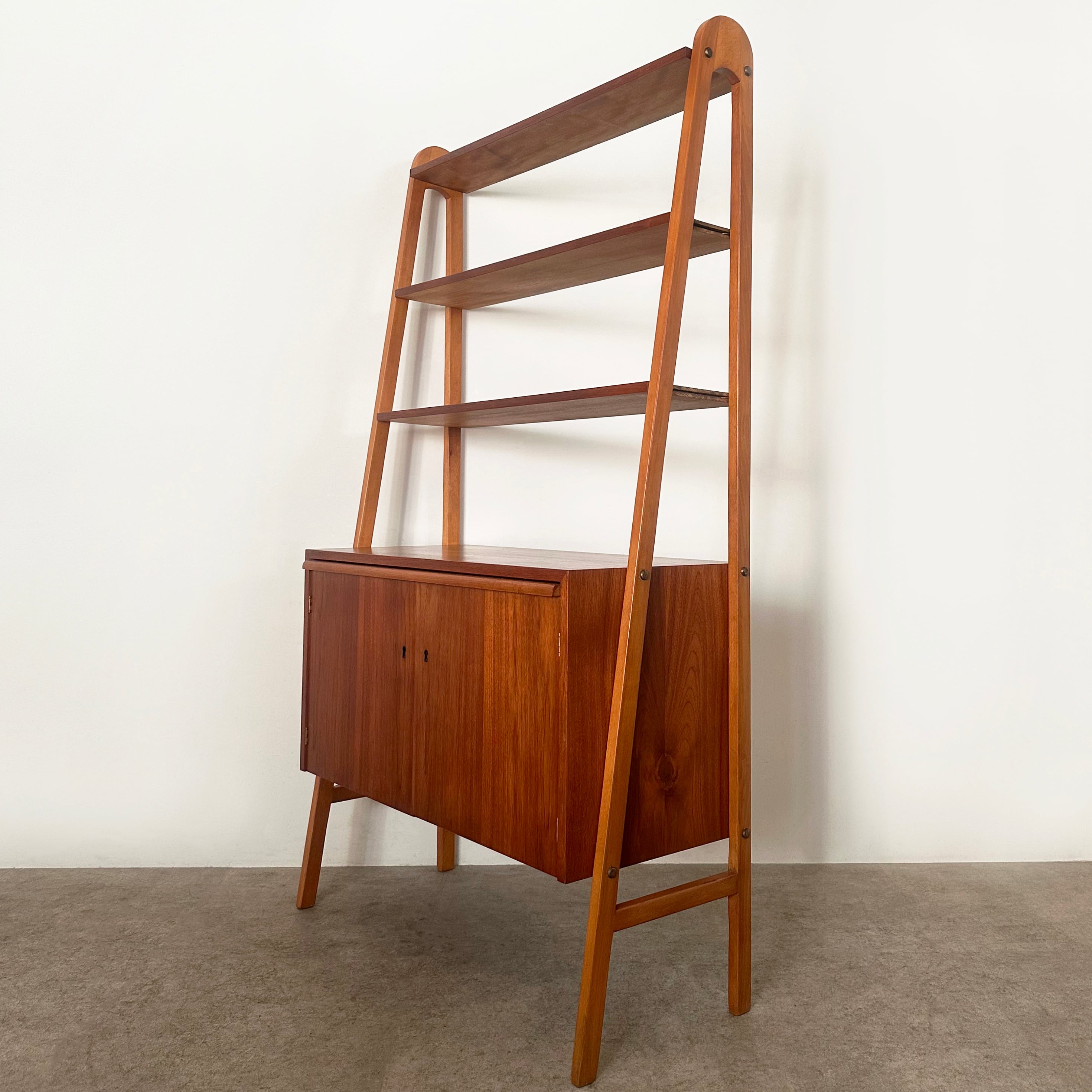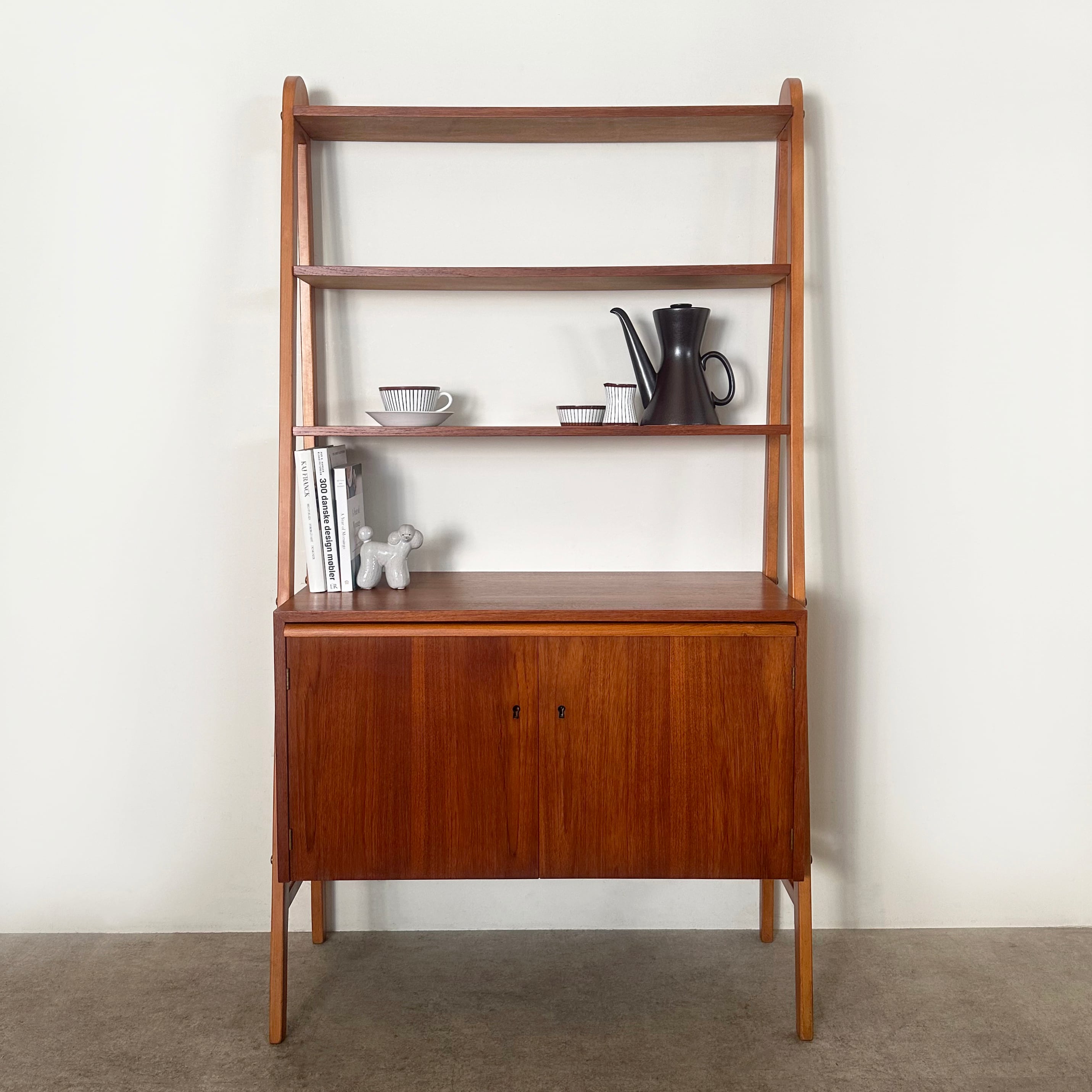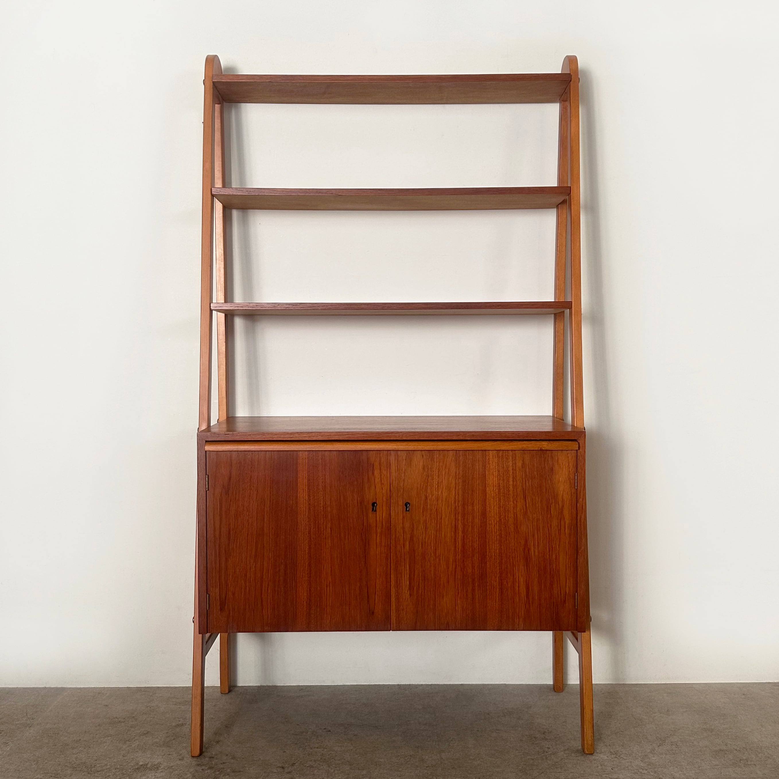 1950年代にスウェーデンで作られたブックシェルフ。木目が鮮やかなチークの収納本体と、それを両側から支える少し明るめなビーチの脚部のコントラストがアクセントとなり、全体を軽やかで立体的に見せています。