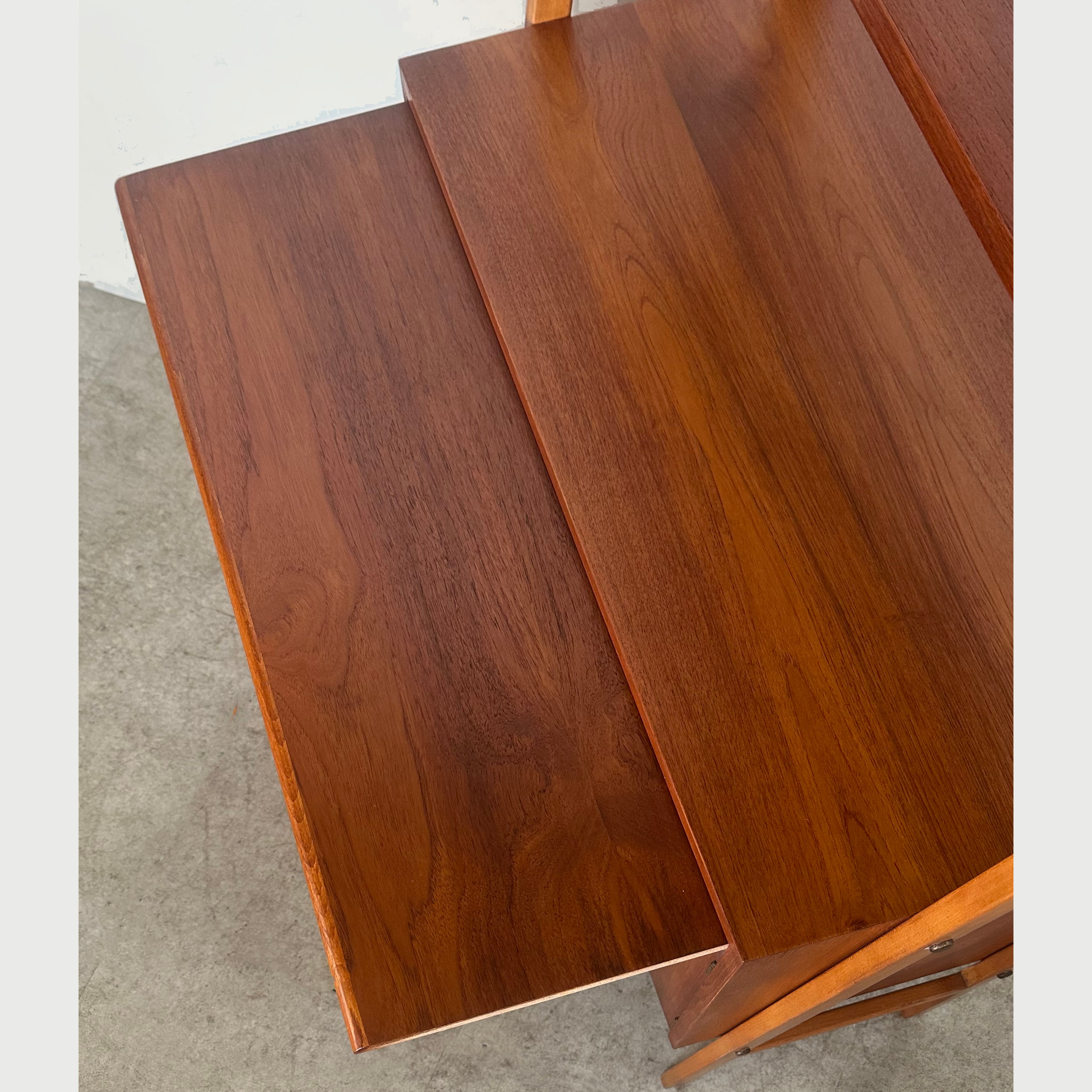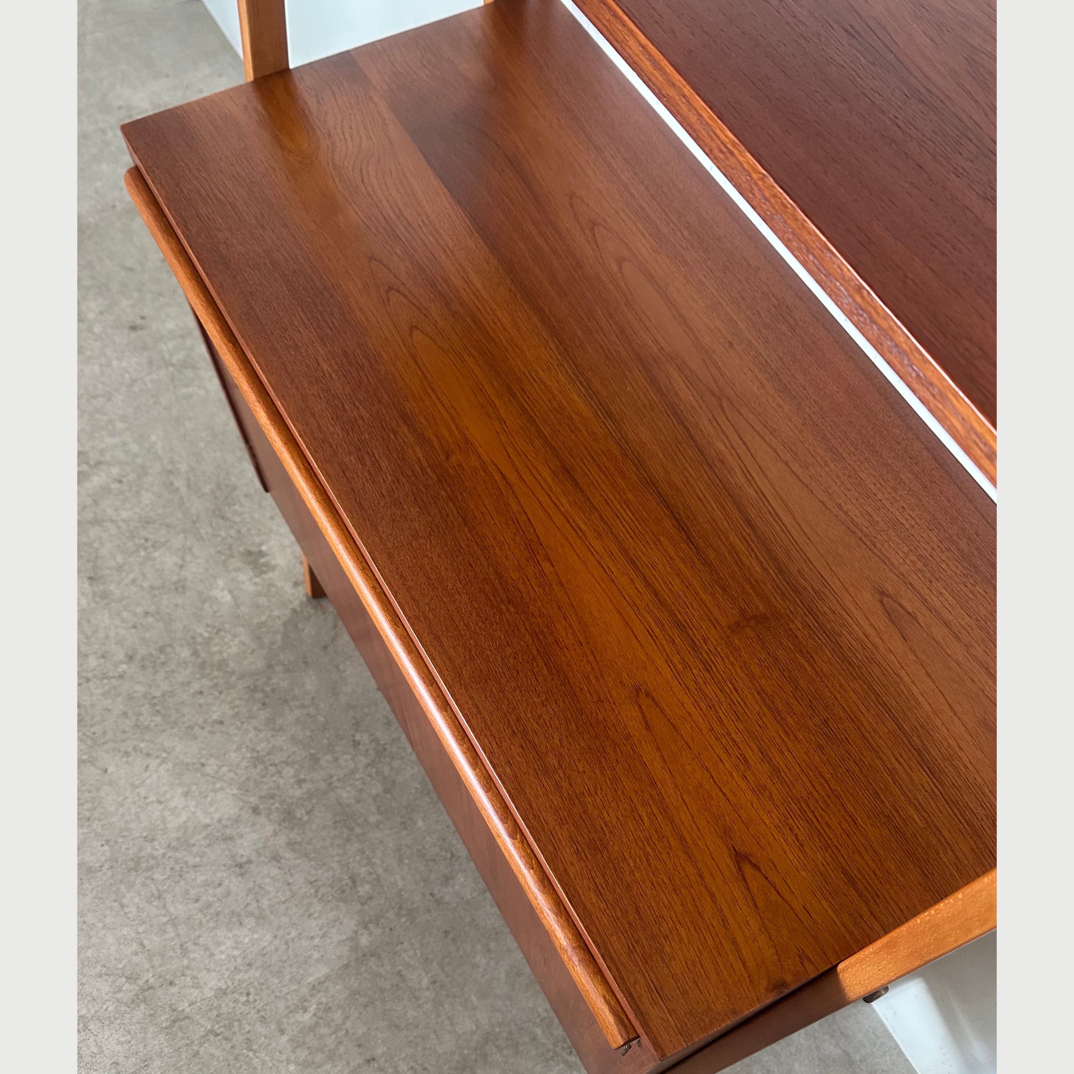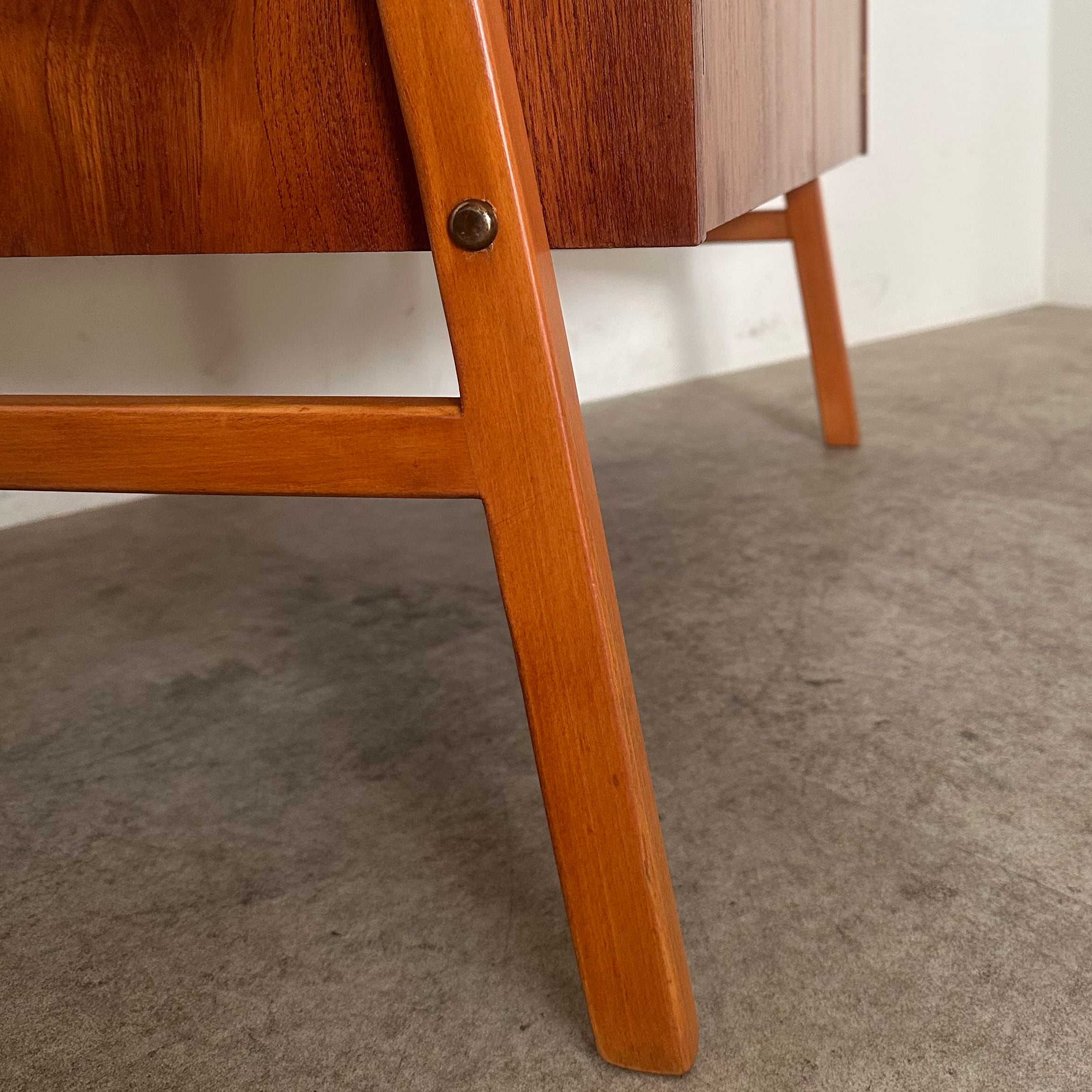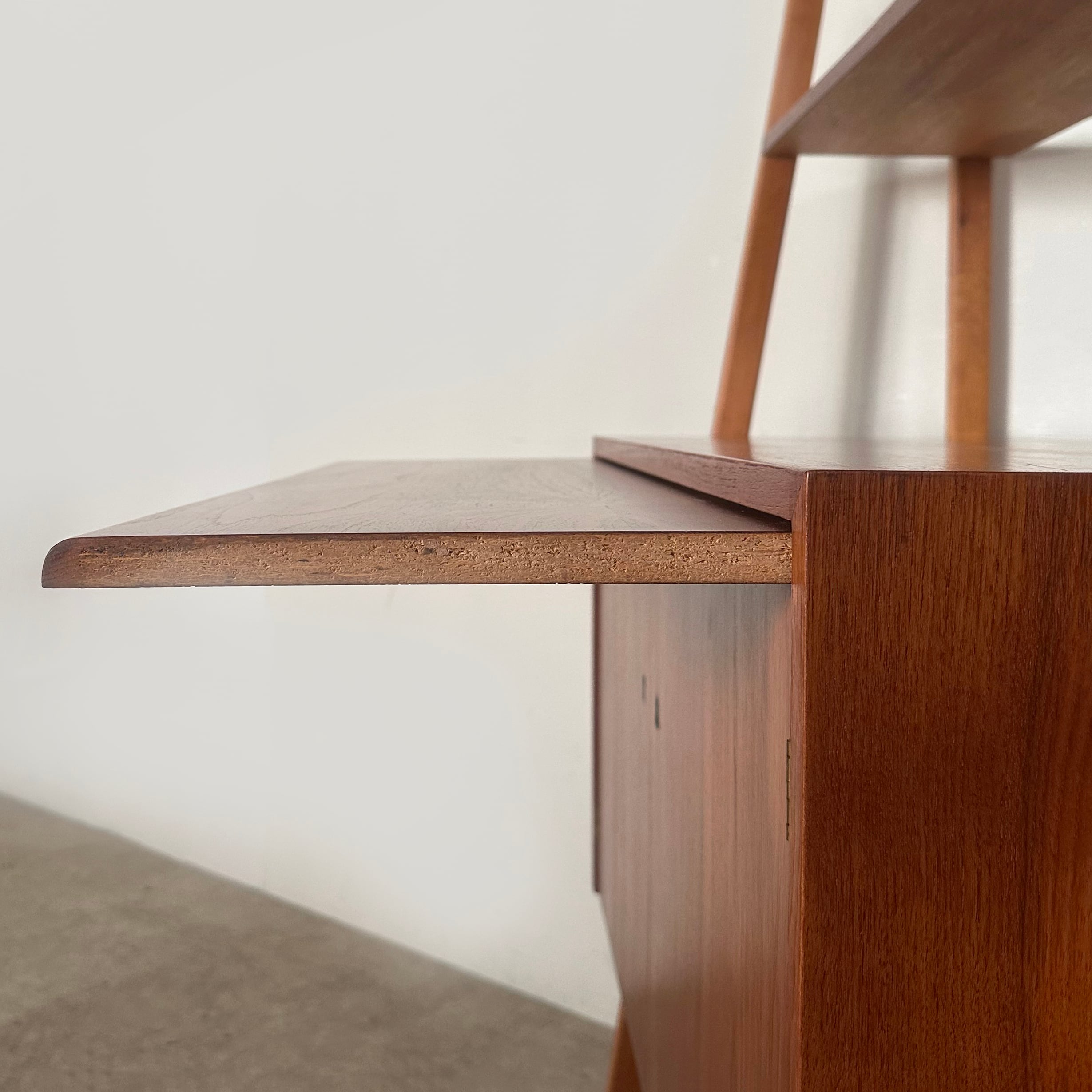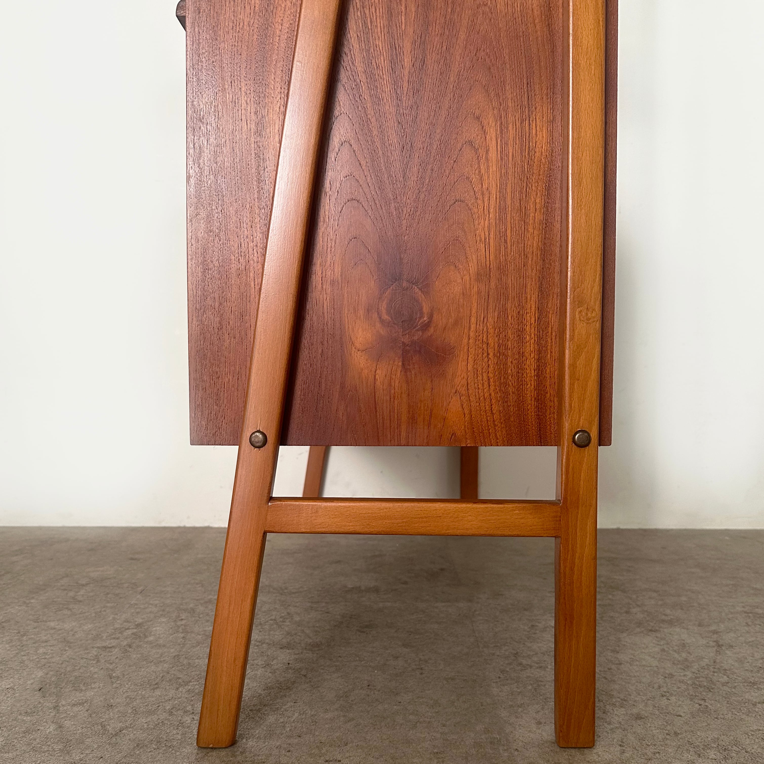 1950年代にスウェーデンで作られたブックシェルフ。木目が鮮やかなチークの収納本体と、それを両側から支える少し明るめなビーチの脚部のコントラストがアクセントとなり、全体を軽やかで立体的に見せています。