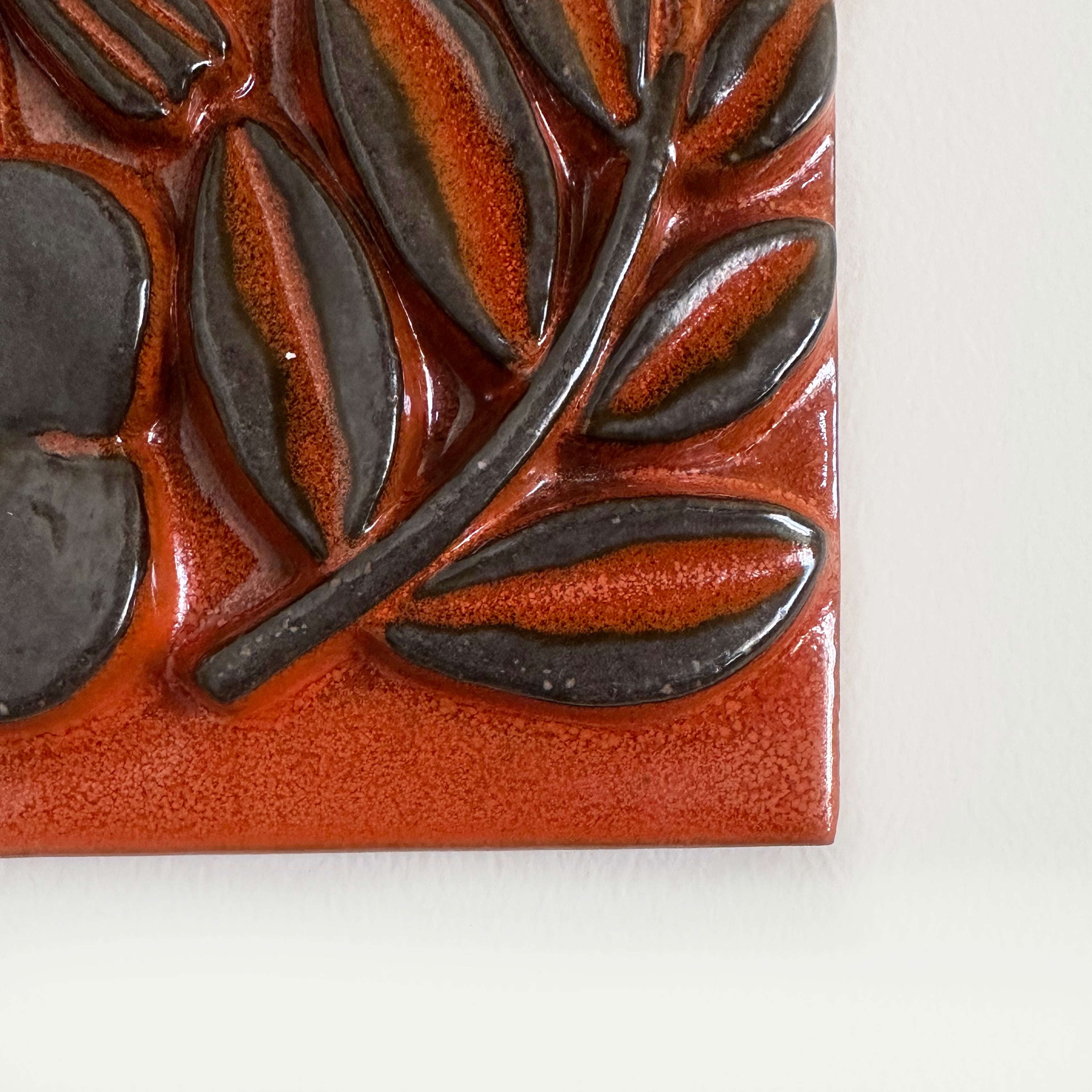 本品は深みのある赤橙色。隅々にまで立体的に描かれた草花は、見る角度によって陰影とともに異なる色彩を見せ、空間を彩るオブジェとしても存在感をもたらします。絵を飾るような感覚で飾っていただきたい一枚です。