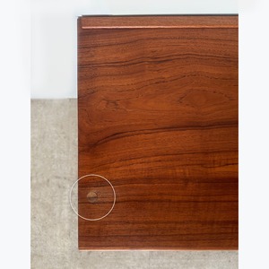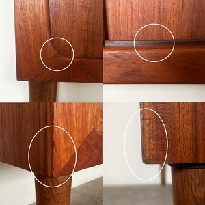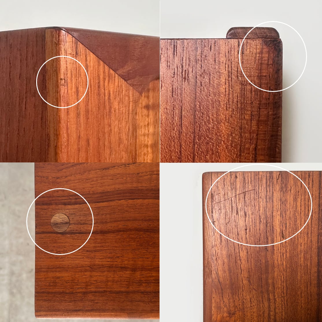 いずれの箇所も全体で見た際に大きく目立つことはなく、家具の印象を損ねるものではありません。丁寧に修復を施しておりますので、清潔感を感じられる仕上がりとともに、経年により味わい深くなったヴィンテージのチークの色合いと、美しい艶を長く楽しんでいただけます。詳しくは画像にてご確認ください。