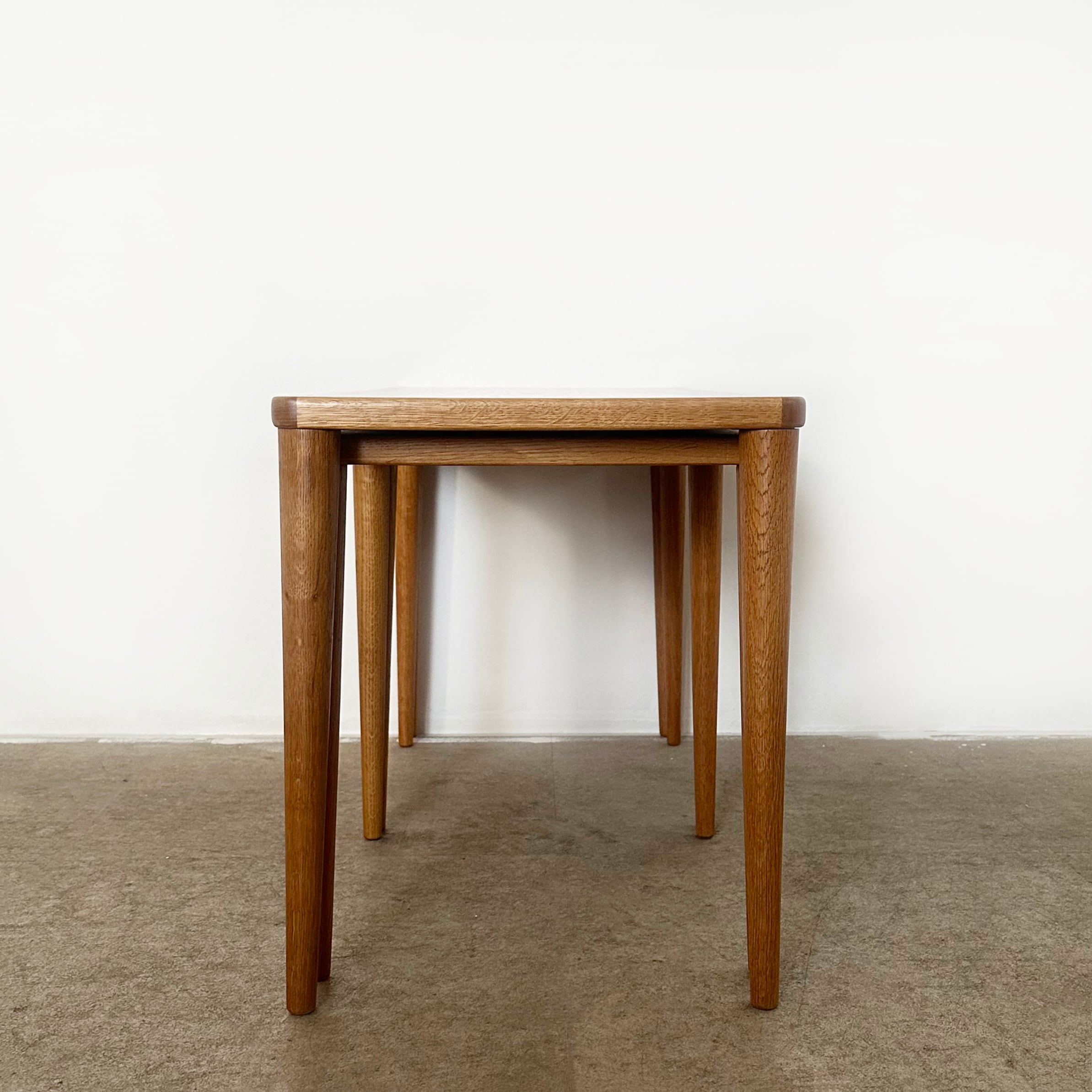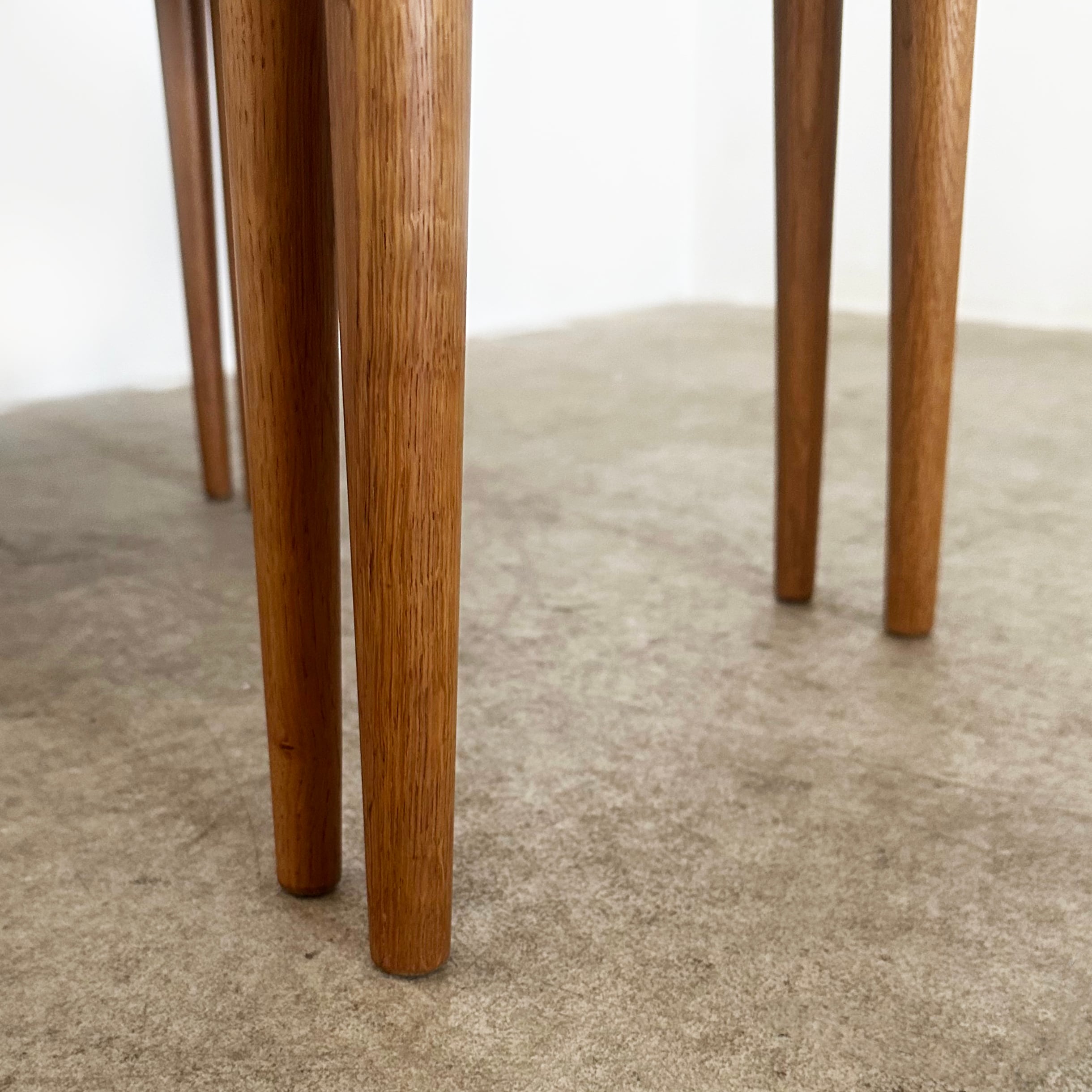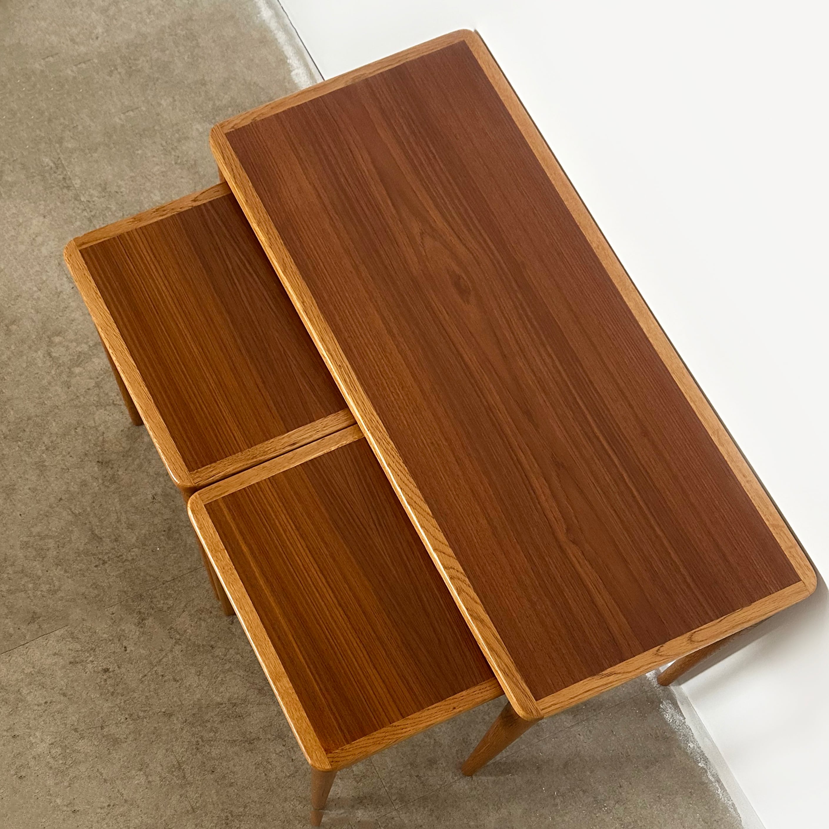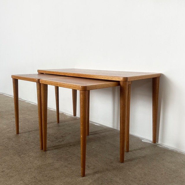 また、同じデザインで大きさが異なる3台が組み合わされていることの多いネストテーブルの中で、形状違いのテーブルが用いられている珍しいスタイルであることも本品の大きな特徴の一つとなっています。