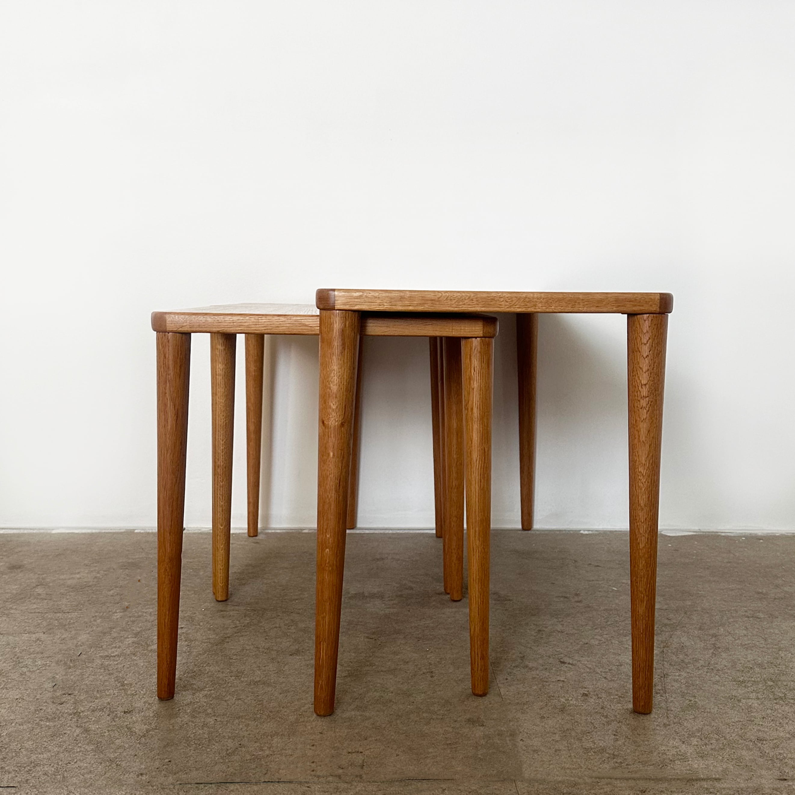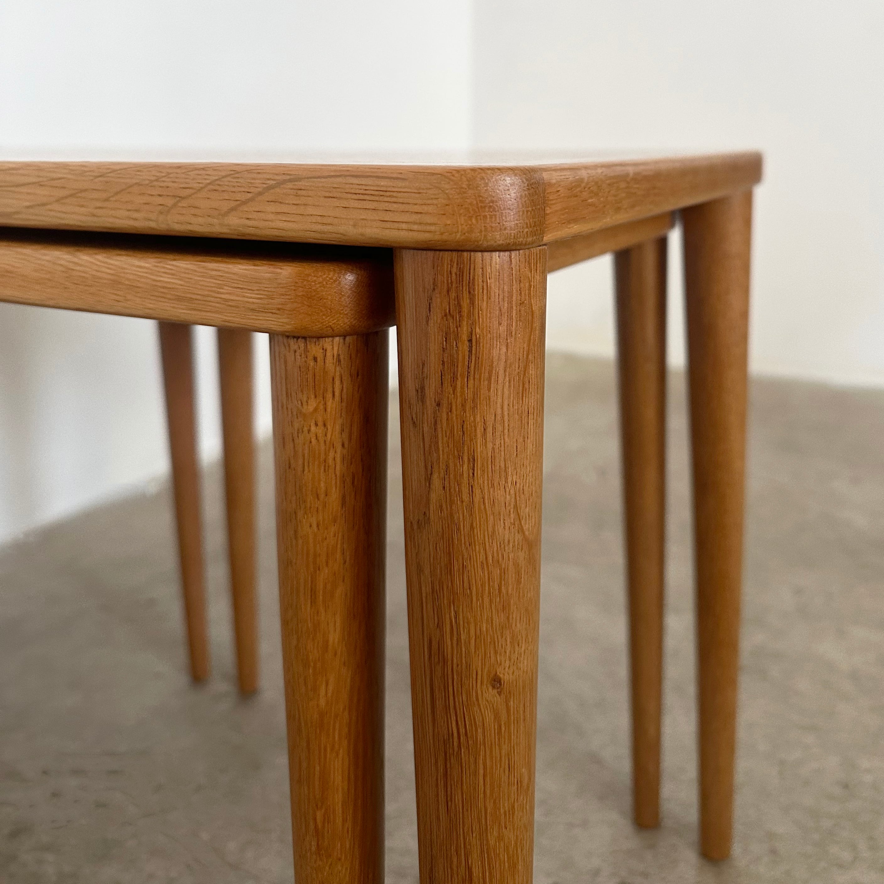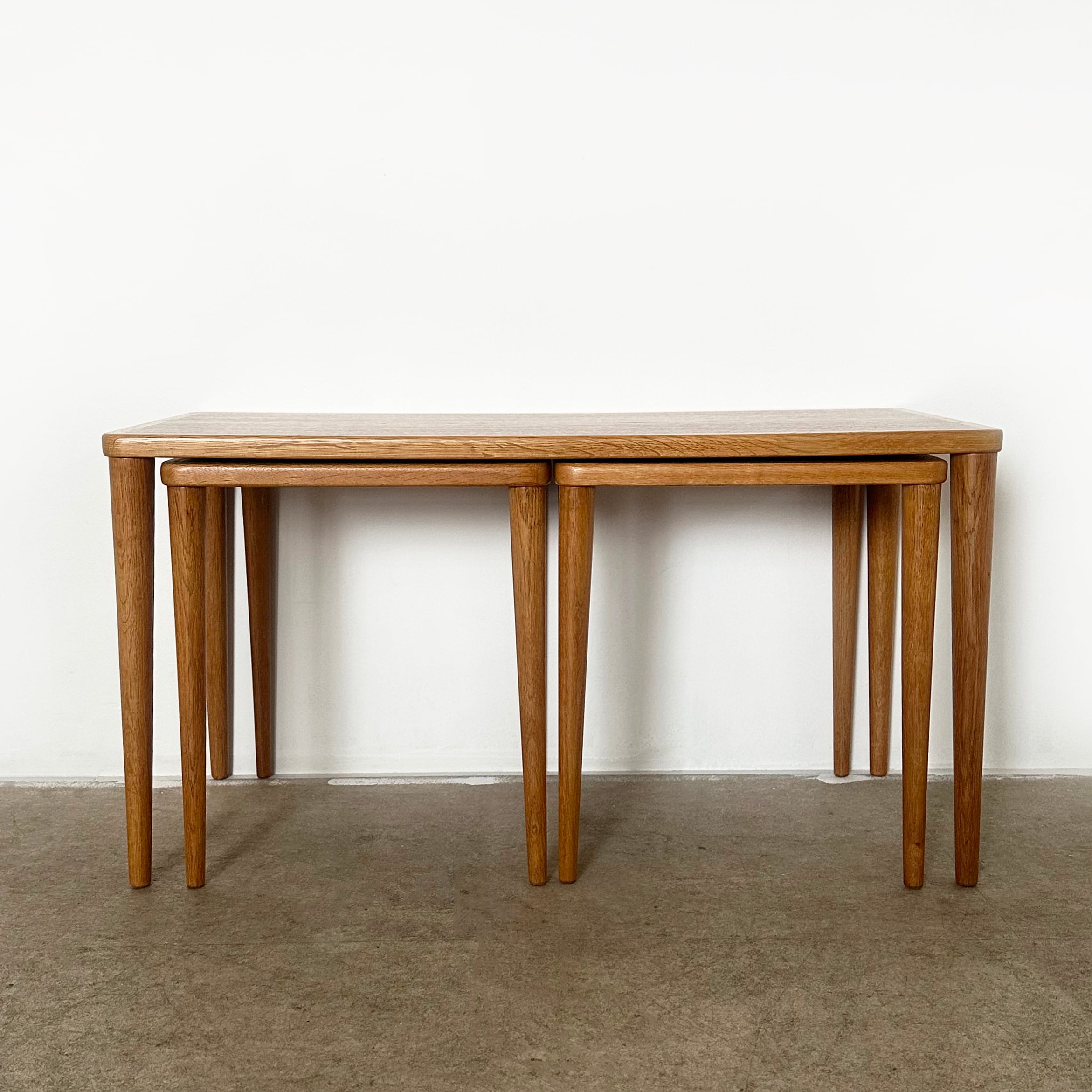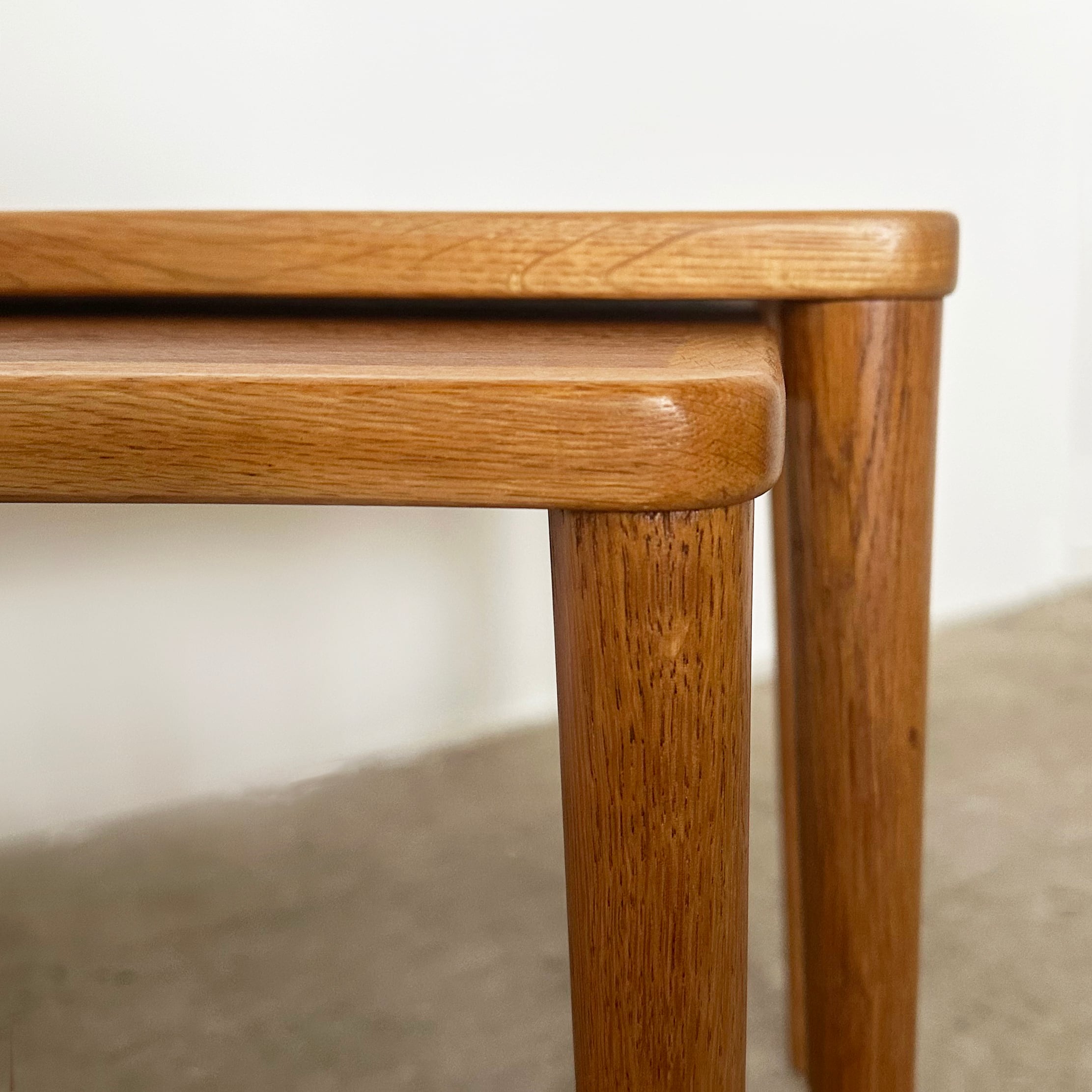 また、同じデザインで大きさが異なる3台が組み合わされていることの多いネストテーブルの中で、形状違いのテーブルが用いられている珍しいスタイルであることも本品の大きな特徴の一つとなっています。