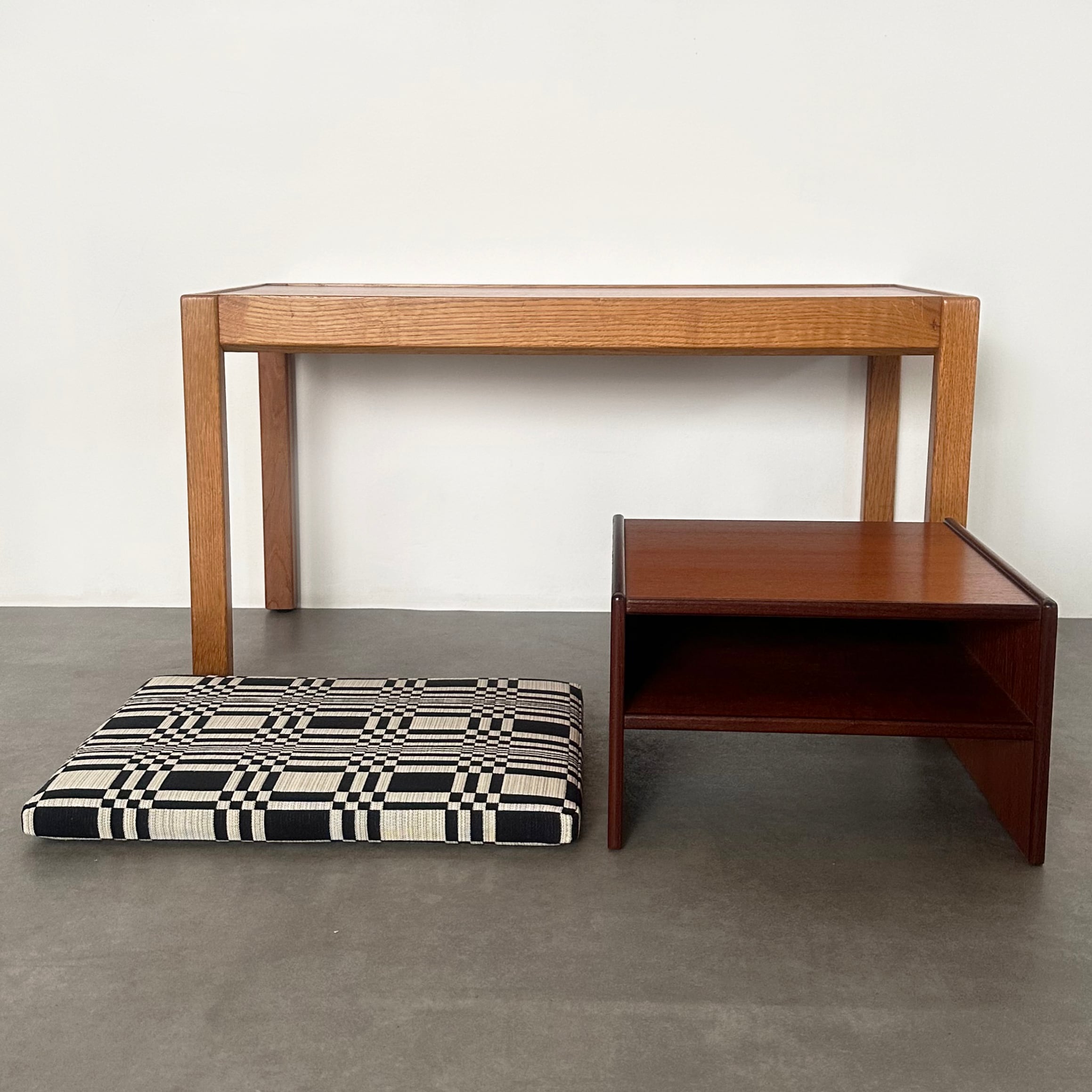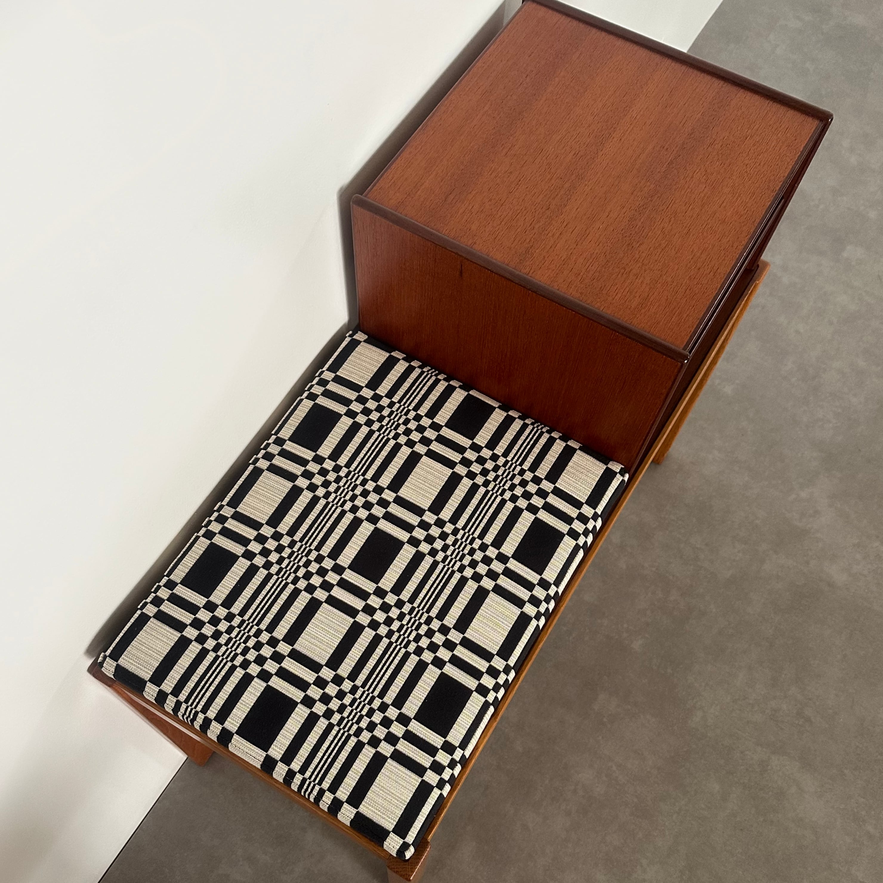 ヨハンナ・グリクセン(Johanna Gullichsen)の代表的なデザイン、ドリス(Doris)を用いたシートクッションは取り外しが可能。腰掛けるだけでなく、ディスプレイスペースとしてなど、用途や空間に合わせたさまざまな設えが楽しめます。また収納パーツも左右どちらにも据えられる仕様なので(ビスでの固定でなく据え置き型)その時々の気分やレイアウトに合わせて自由にアレンジできるのもこの家具ならではの魅力です。