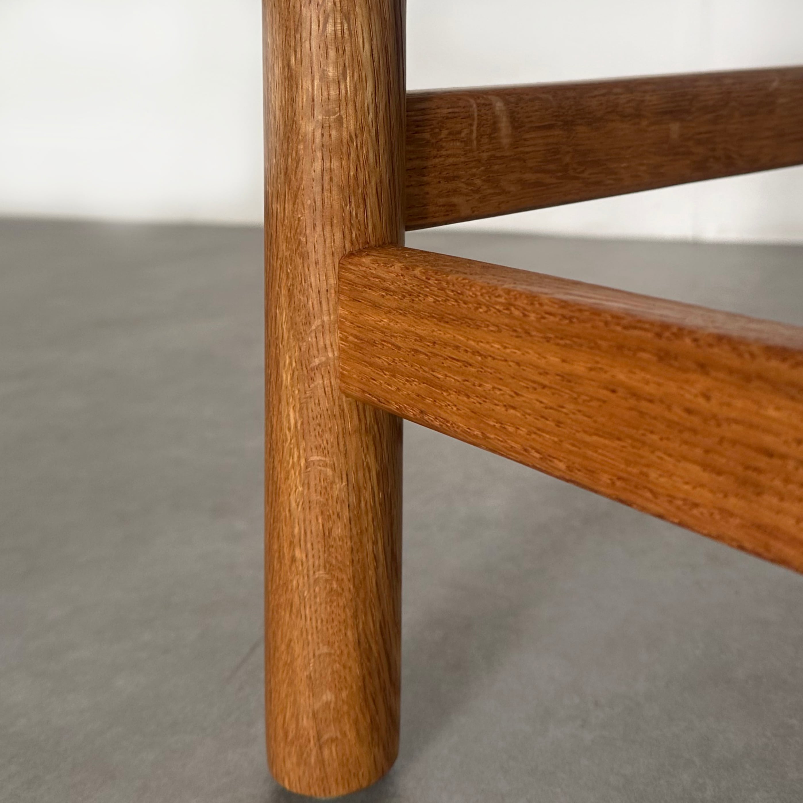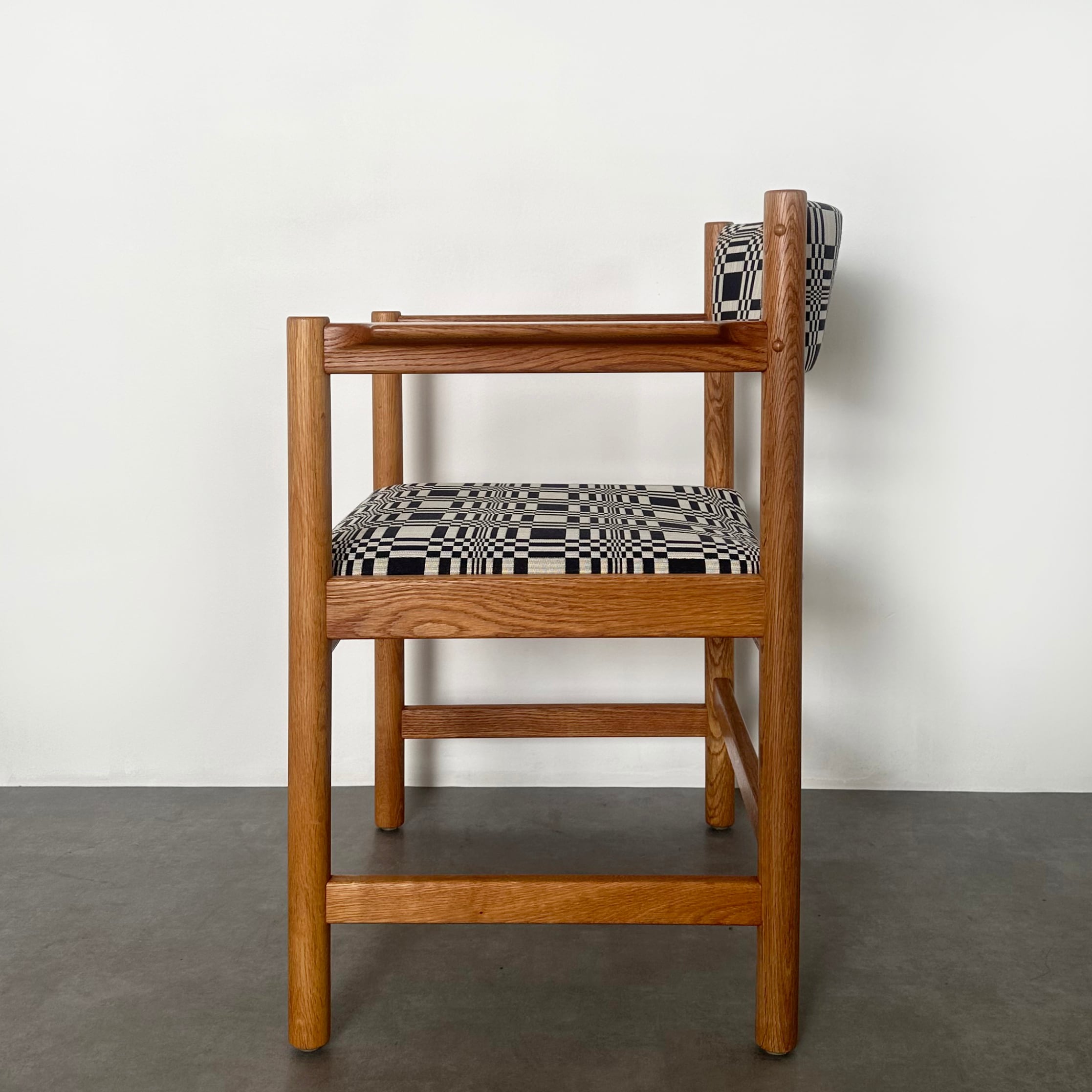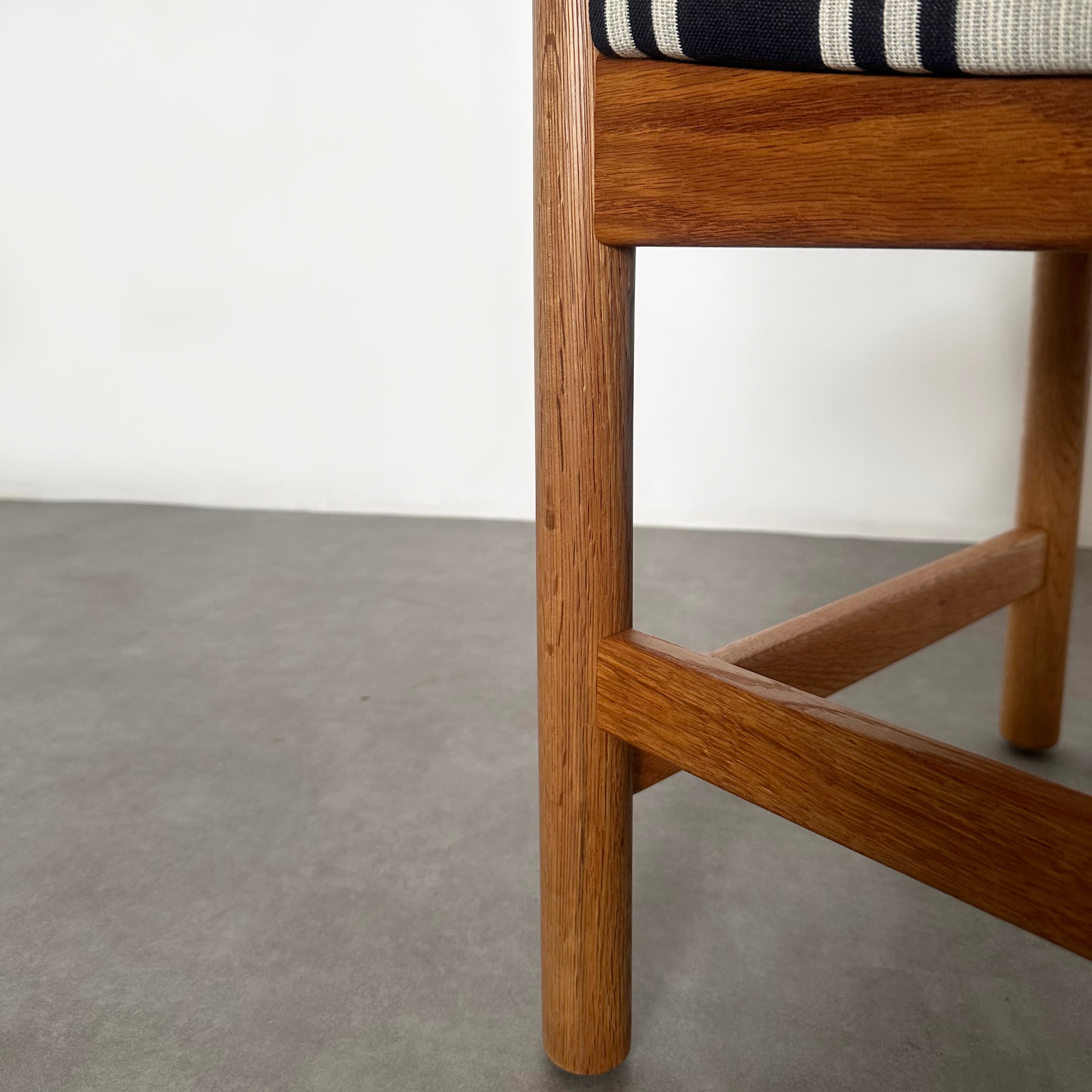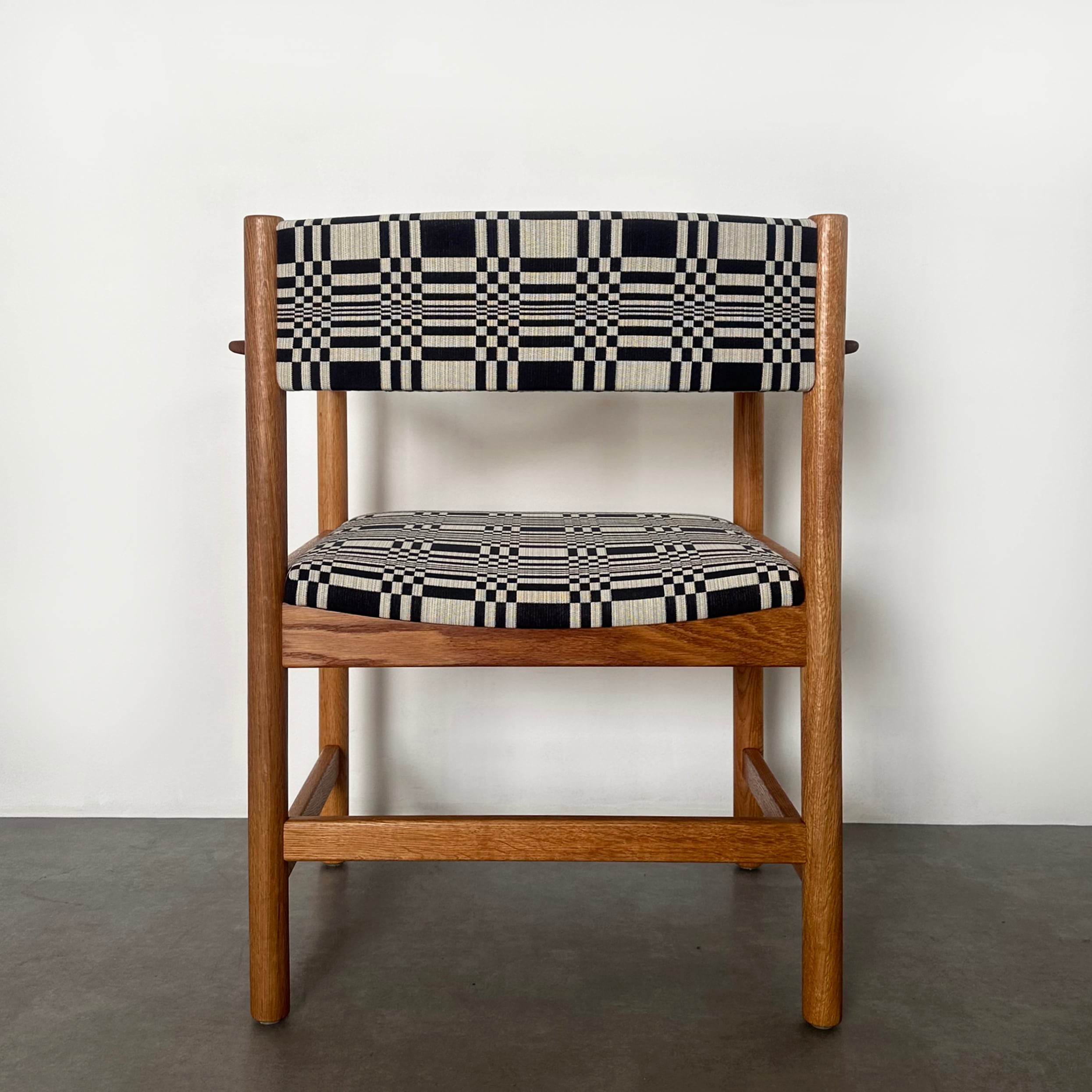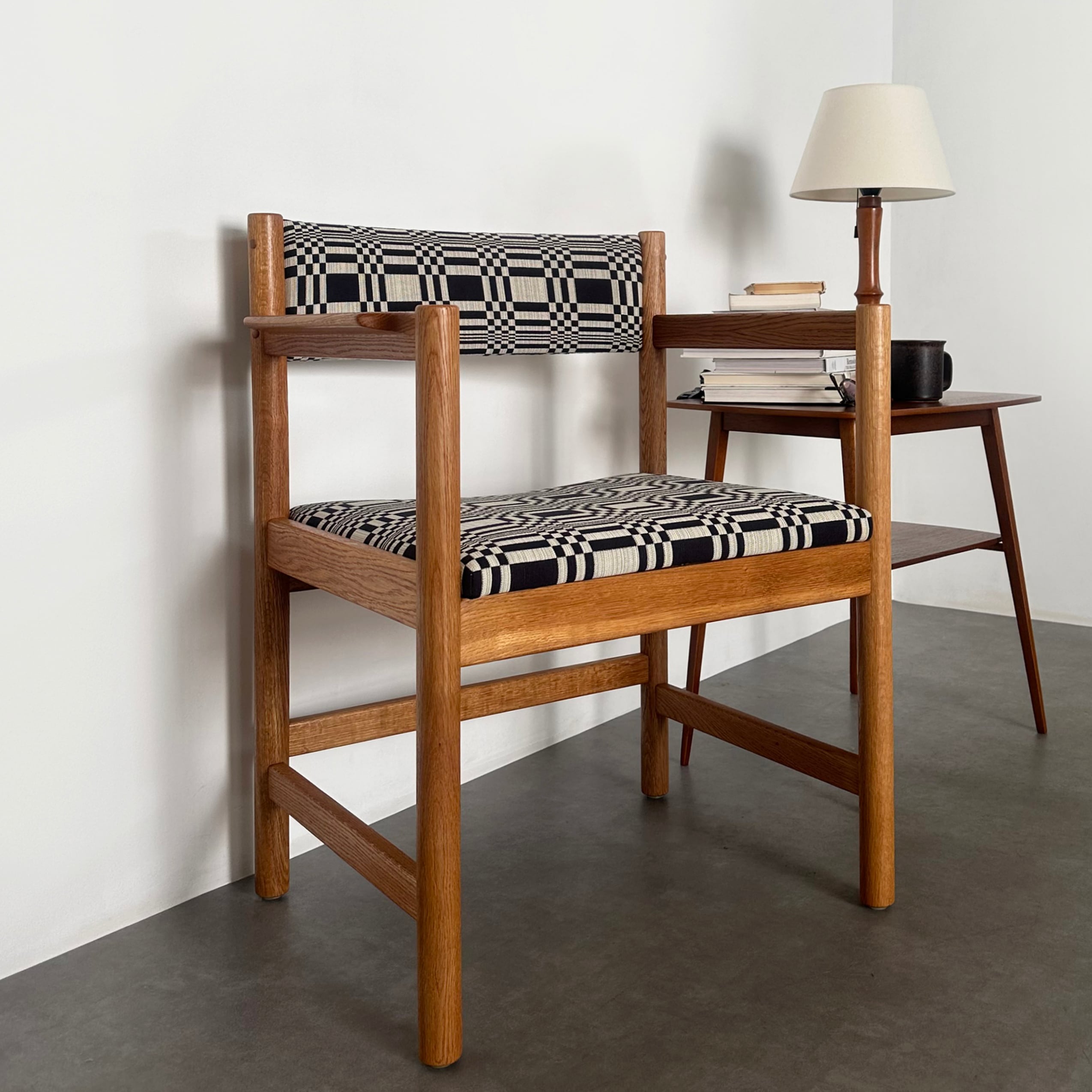 オークの無垢材で構成されたシンプルなフォルムはモーエンセンならでは。アームにはモーエンセンの代表作の一つであるスパニッシュ ダイニングチェアを思わせる意匠が施されています。実直さと素朴な温かみを感じるデザインの中にしっかりと耐久性が考慮されているのもモーエンセンの椅子の特徴の一つ。長い年月を経た今もなお十分な機能性を保っています。それぞれのパーツがほぼ直角で構成されているのでかっちりとした印象ですが、背もたれの緩やかなカーブが腰掛けた時に背中をしっかりと支え、アームは自然と肘がかかるように設計されているので、長い時間でも心地よく座ることができます。