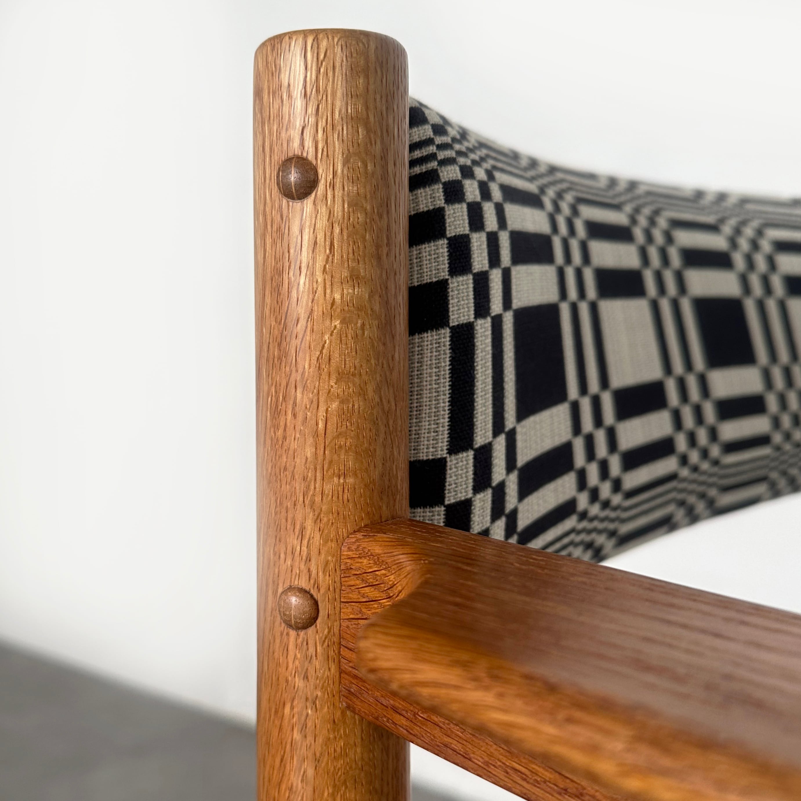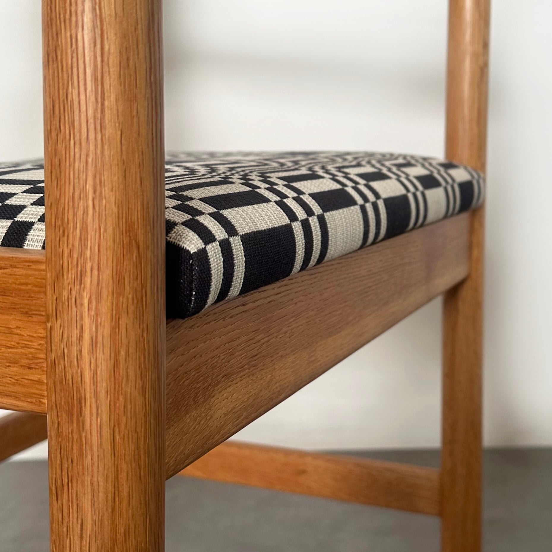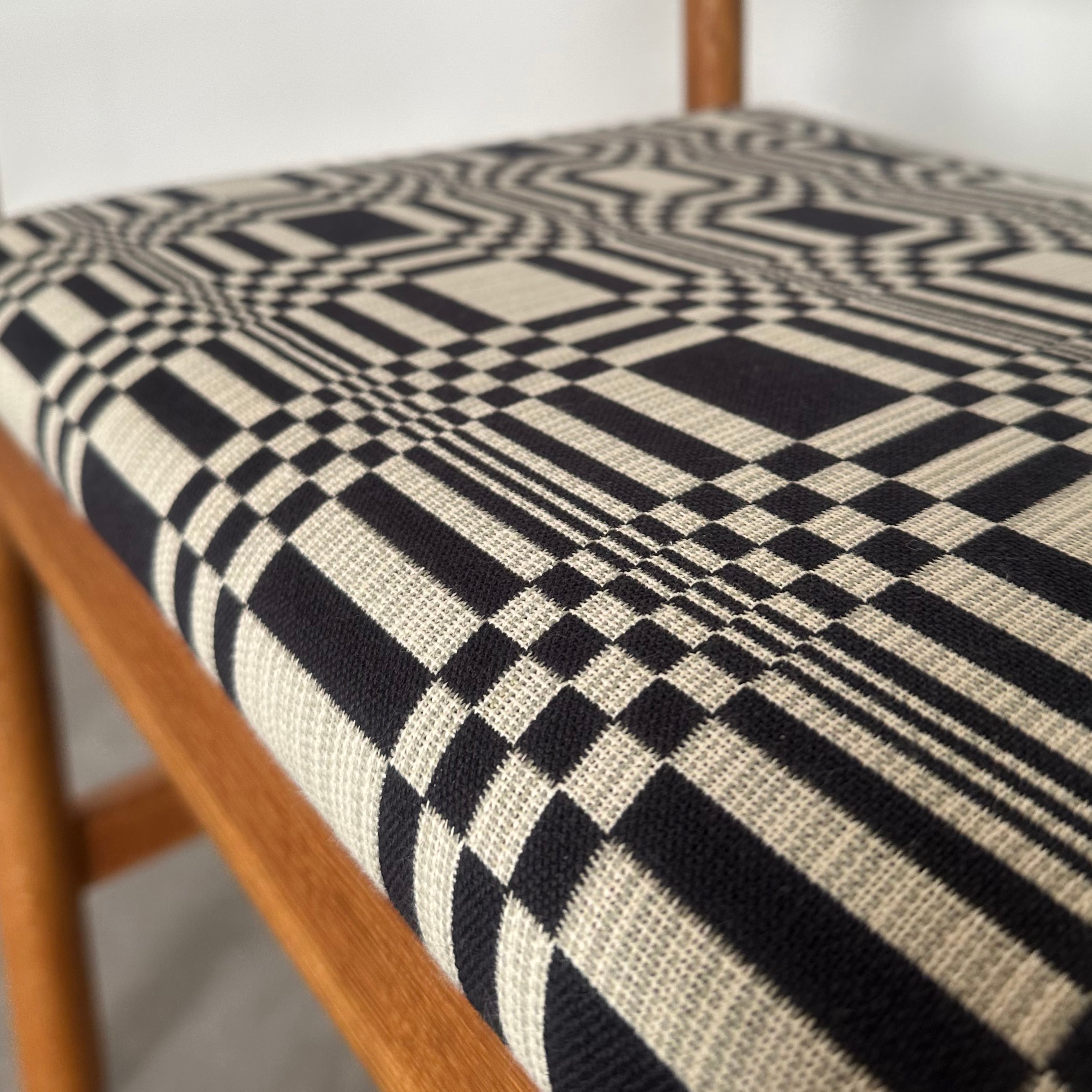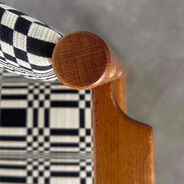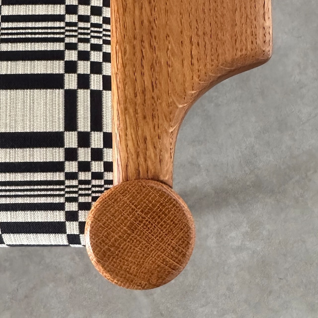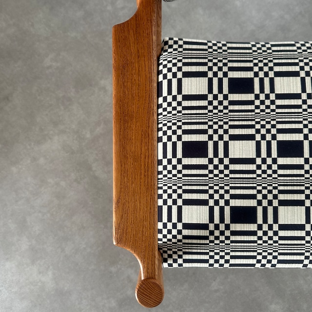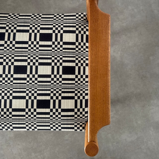 ・張り地はフィンランドを代表するテキスタイルブランド、ヨハンナ・グリクセン(Johanna Gullichsen)の代表的なデザイン、ドリス(Doris)をあわせました。白と黒のコントランストが織りなす立体感のあるグラフィカルなパターンが、シンプルなフォルムの椅子を個性的な一台へと設えています。