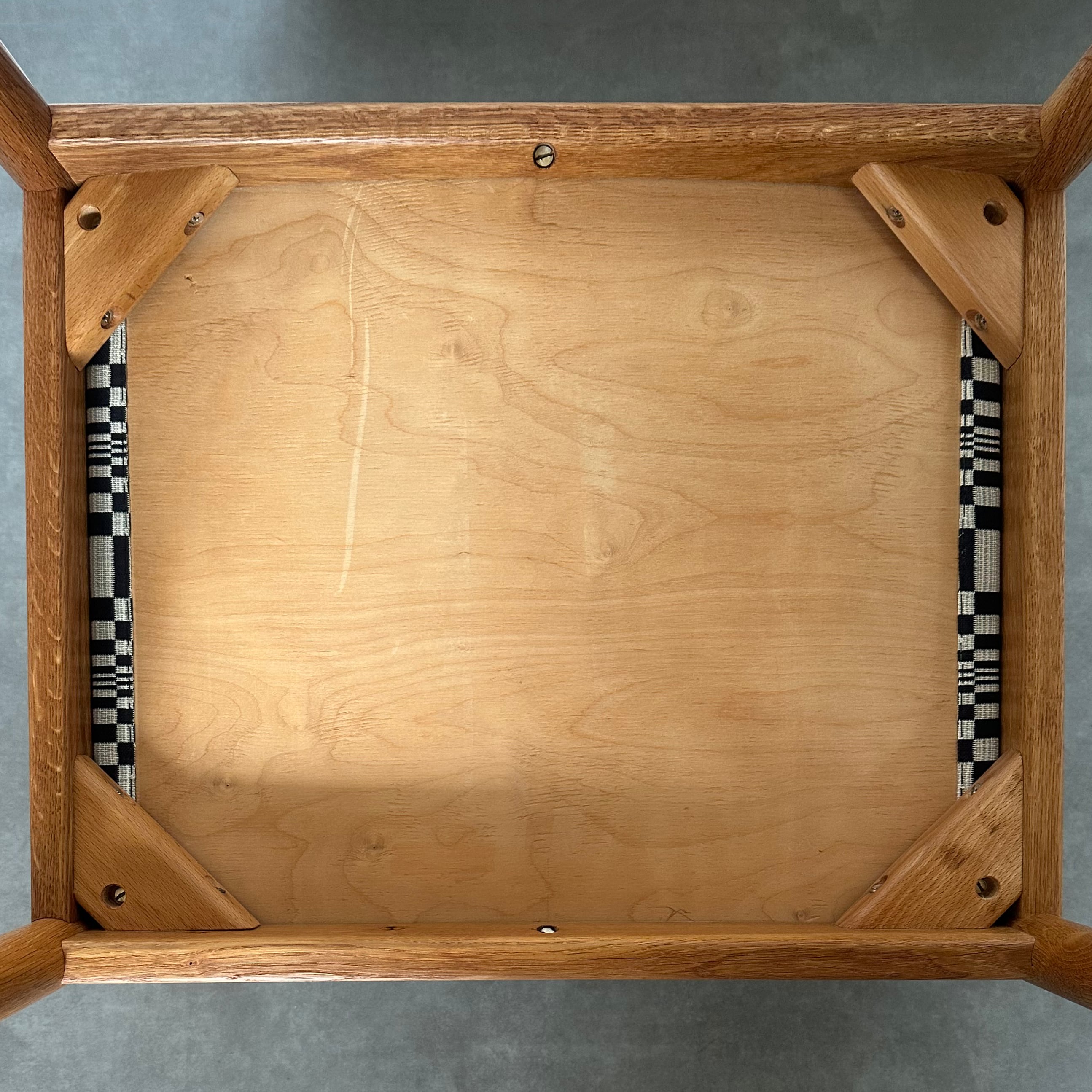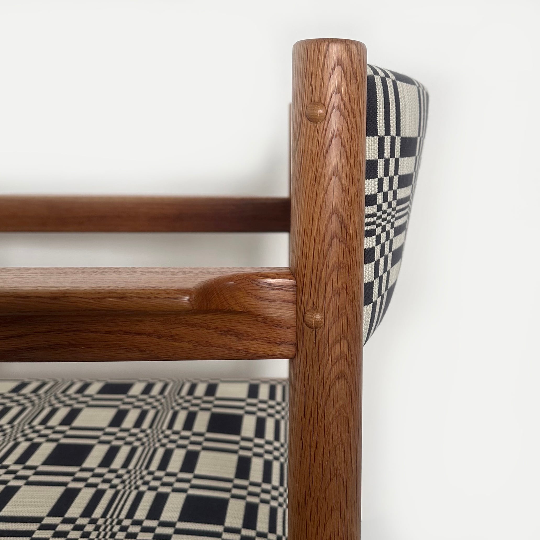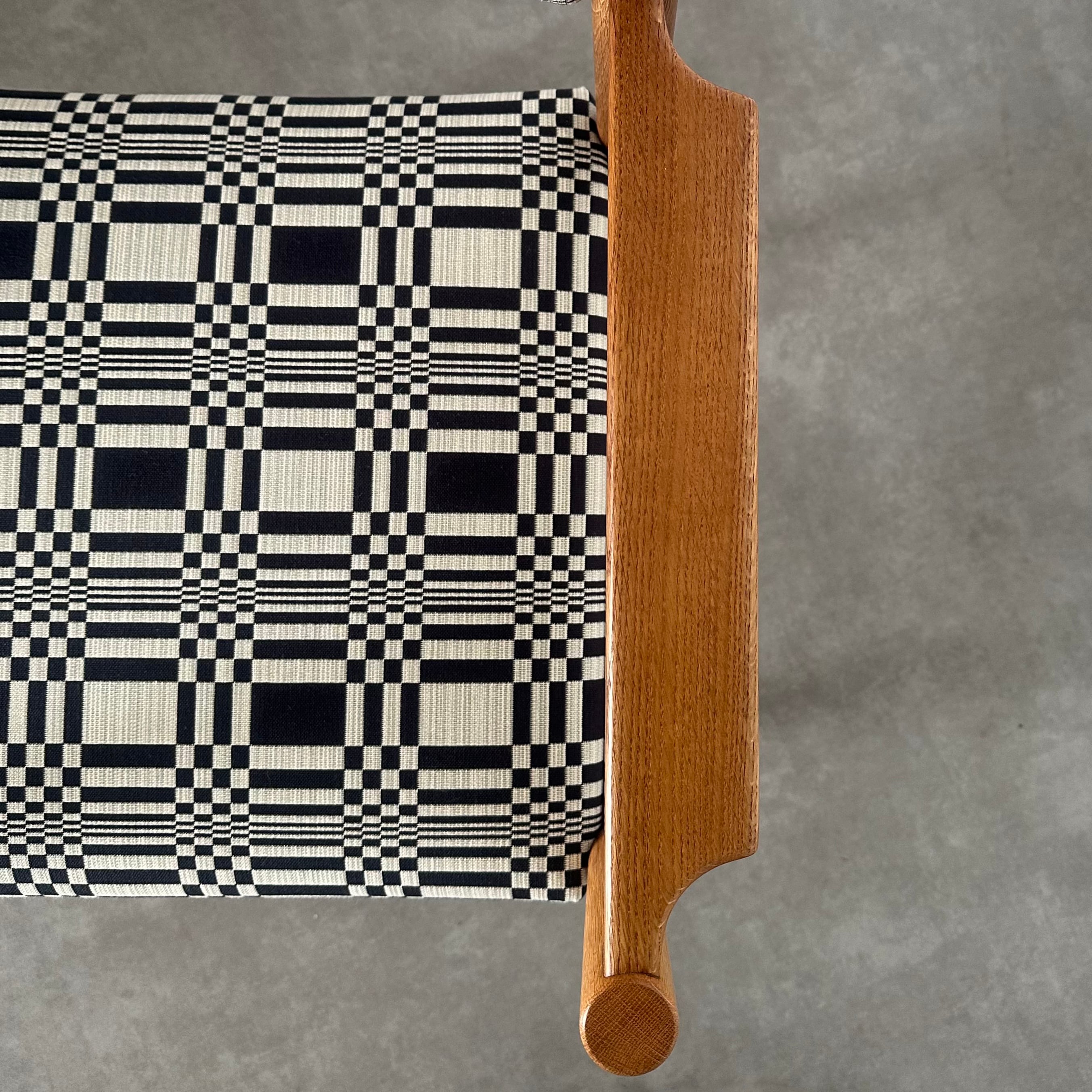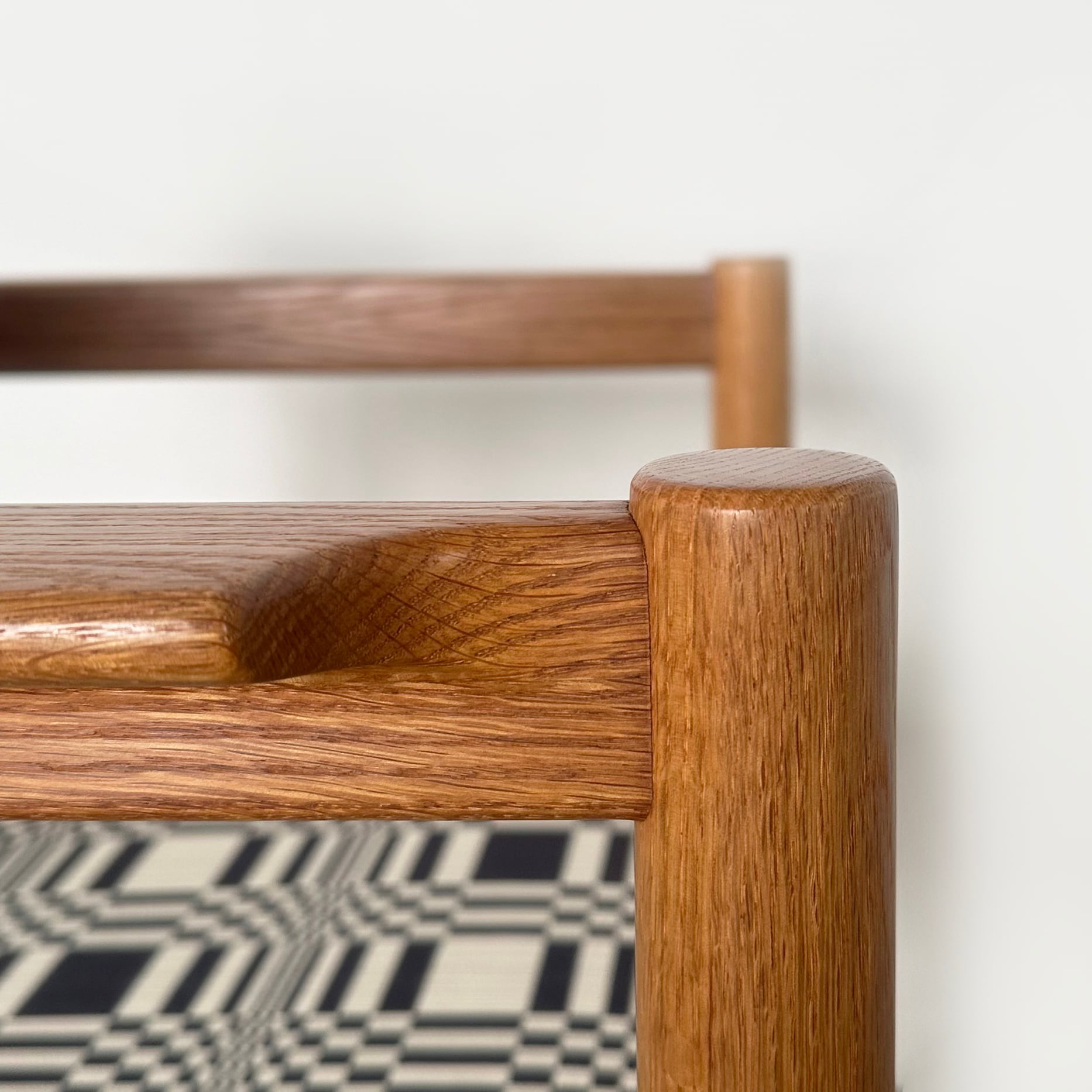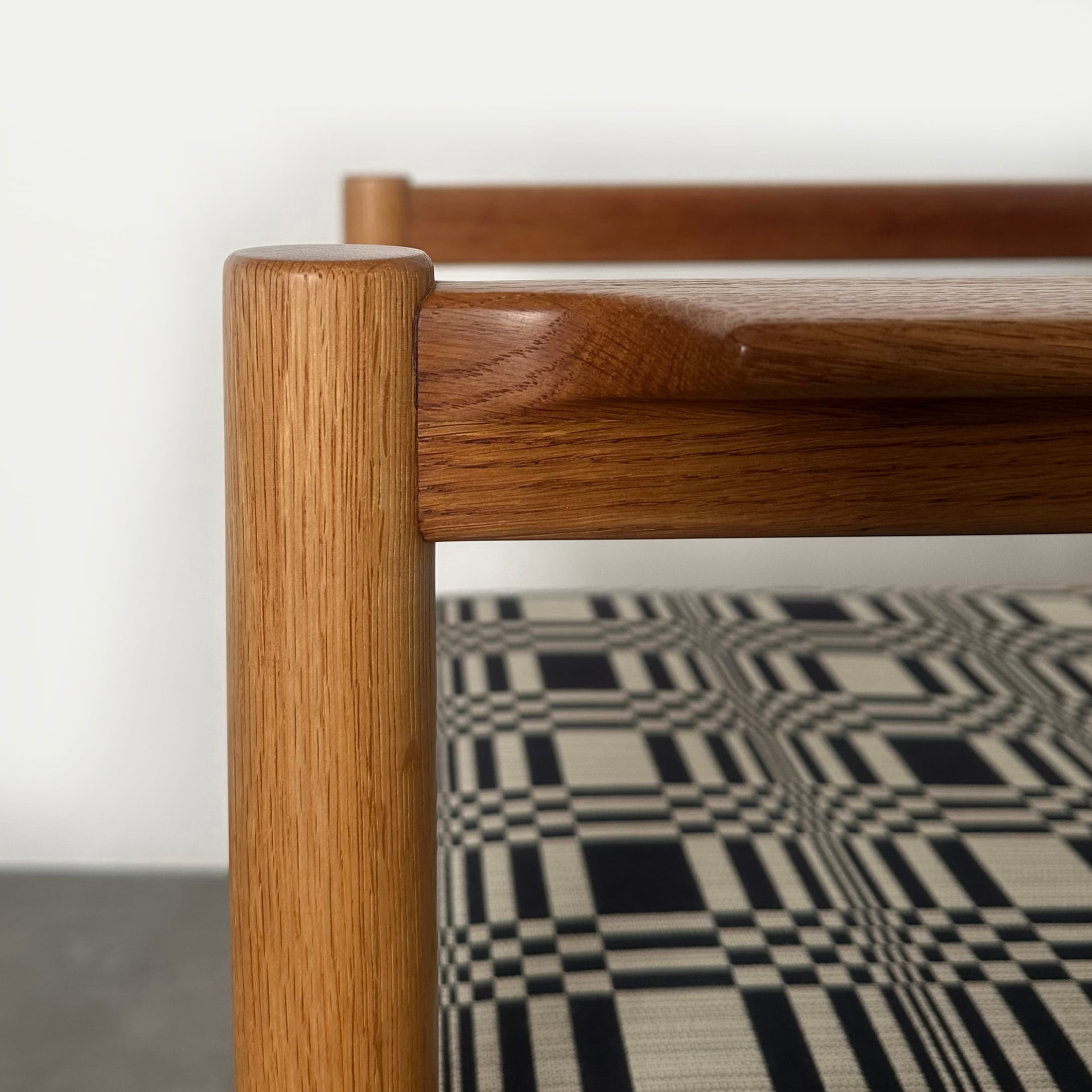 ・張り地はフィンランドを代表するテキスタイルブランド、ヨハンナ・グリクセン(Johanna Gullichsen)の代表的なデザイン、ドリス(Doris)をあわせました。白と黒のコントランストが織りなす立体感のあるグラフィカルなパターンが、シンプルなフォルムの椅子を個性的な一台へと設えています。