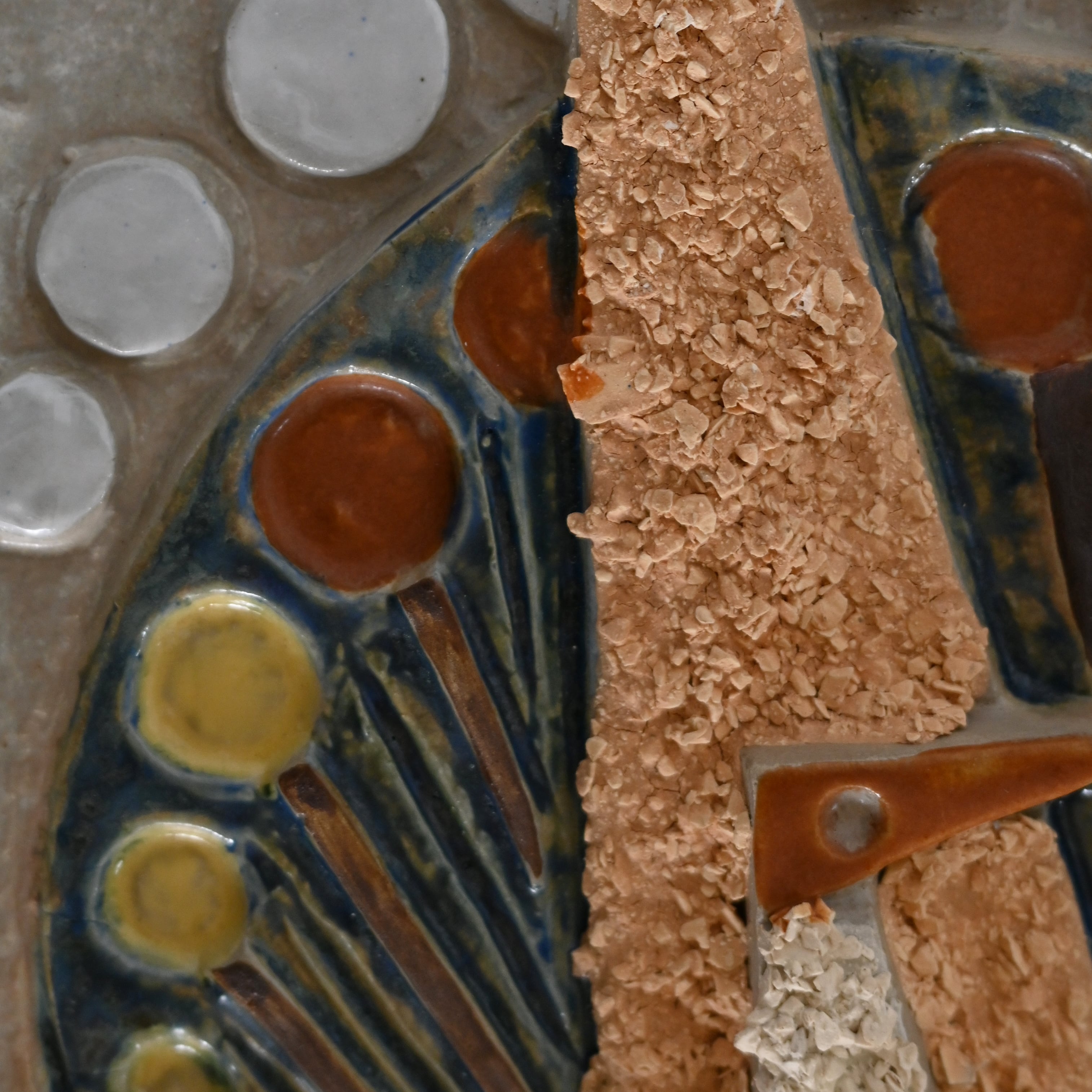 植物や鳥といった身近なモチーフを円や三角形などのシンプルな形に置き換え、のびやかに構成するのが彼の特徴。やわらかな釉薬の色合いと立体的なレリーフが重なり合い、陶土そのものの質感を活かした表情が生まれています。