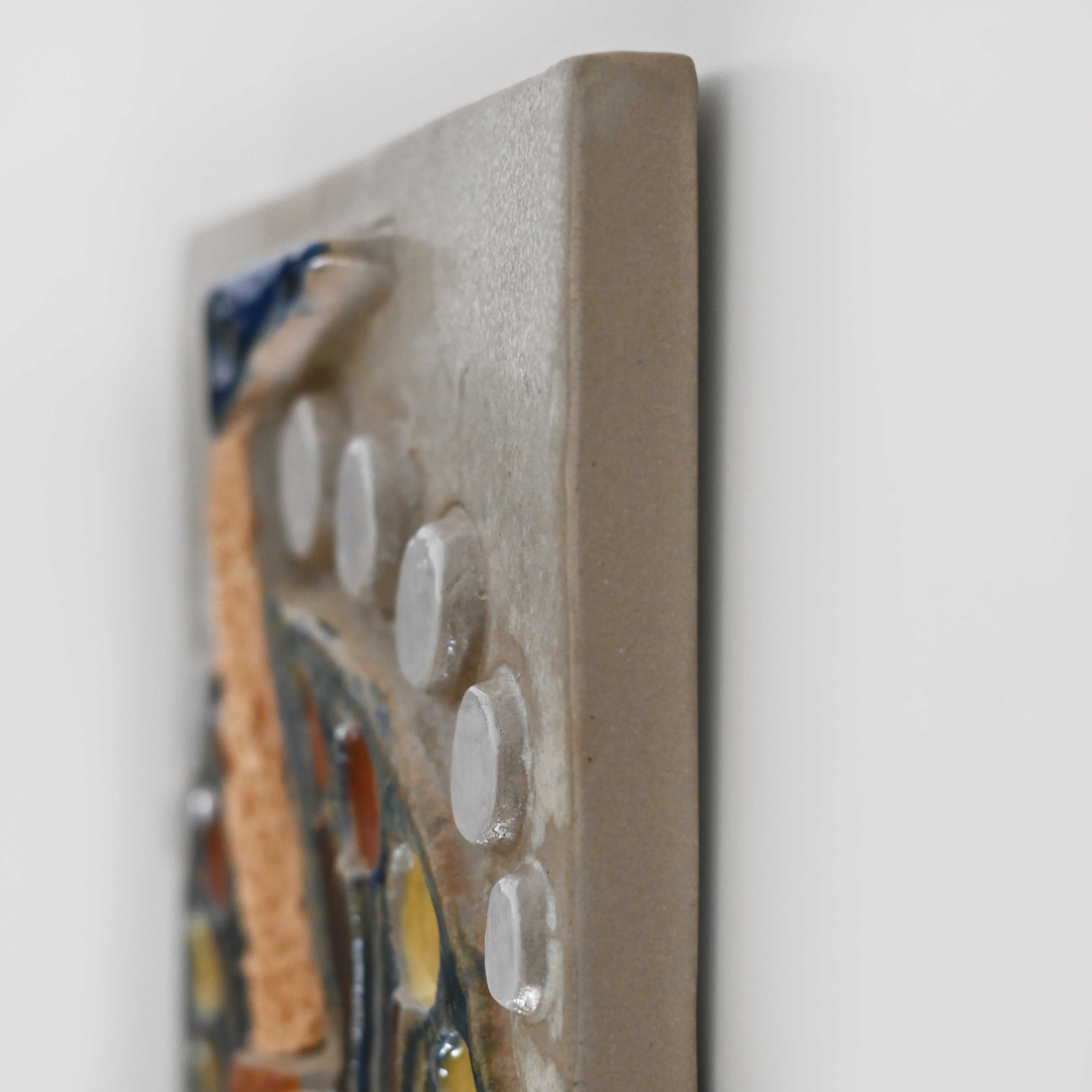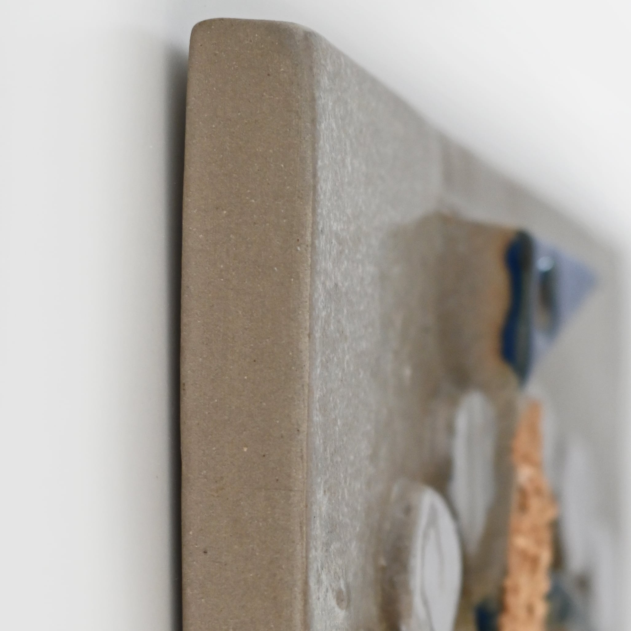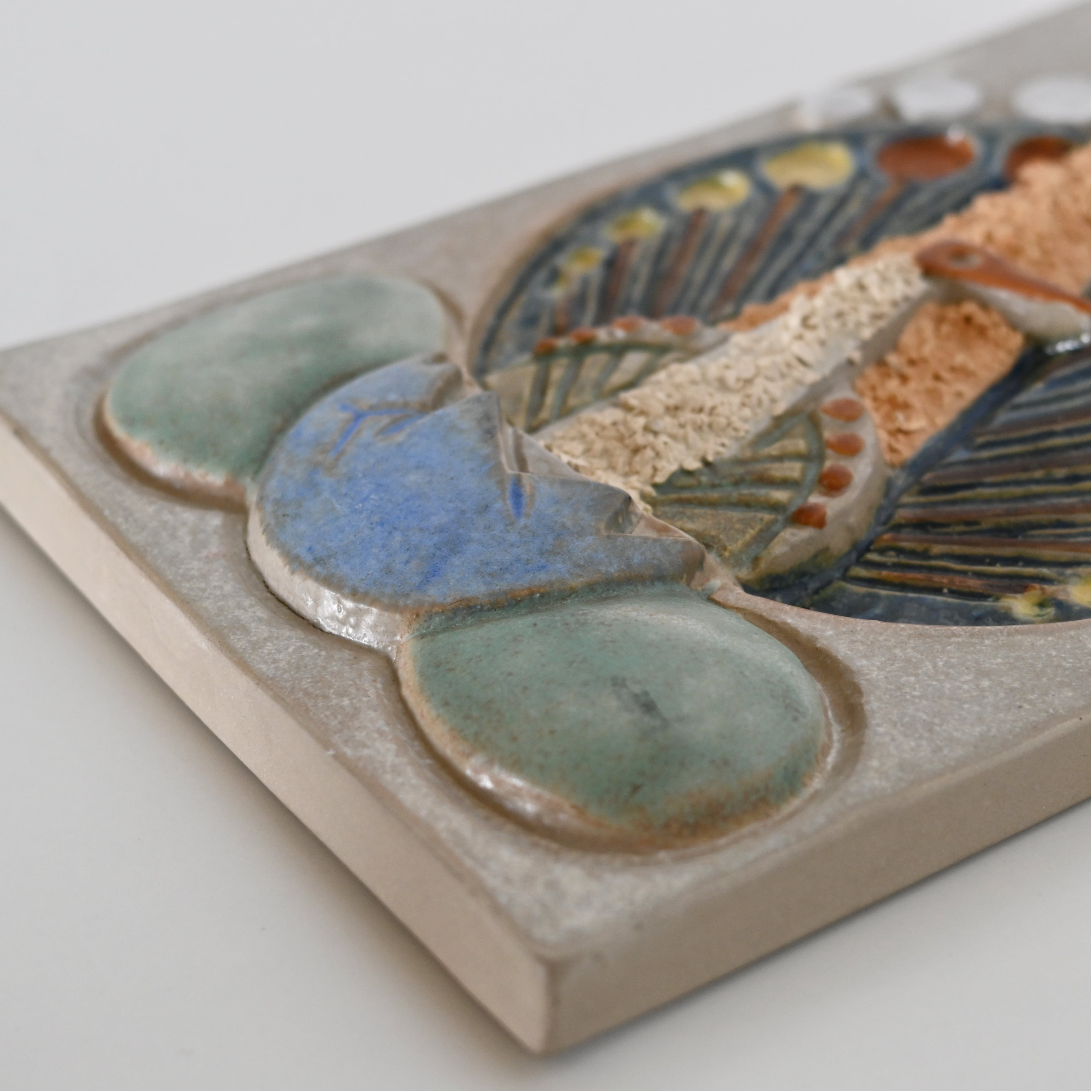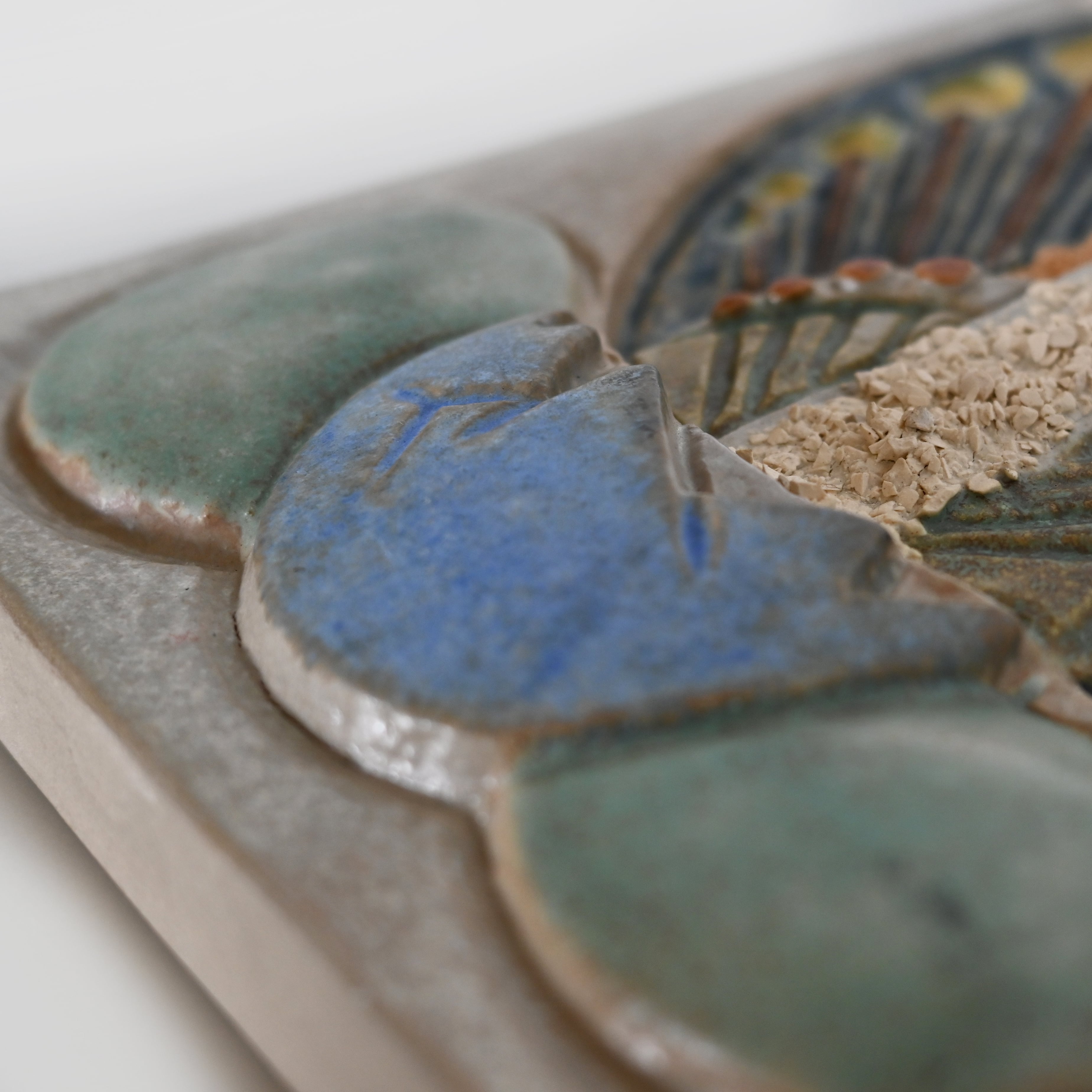 本品では、落ち着いた色調の中にリズムよく配置されたモチーフが印象的で、陶板でありながら一枚の小さなアートのような存在感を放ちます。親鳥と雛鳥の胸元には、粒子感のある化粧土を用い、ふんわりとした羽毛を思わせる質感を表現。視覚だけでなく触感までも想像させる、さりげない工夫が光ります。