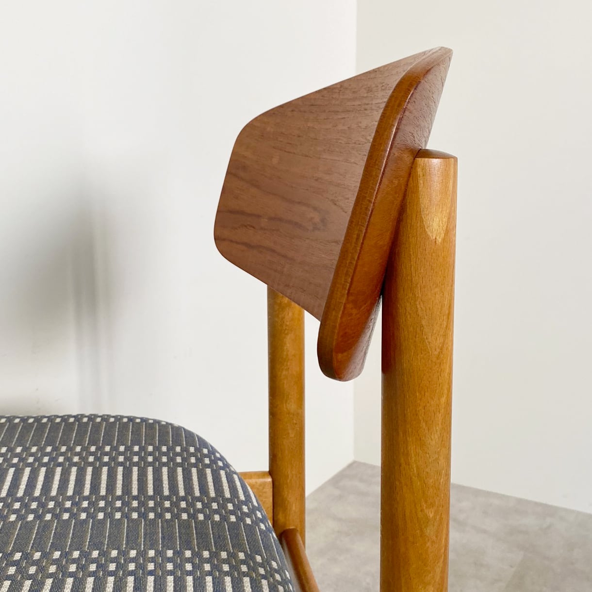 全体を丁寧にクリーニング、メンテナンス後、オイルとワックスをかけました。目立つダメージはなく、木目にヴィンテージならではの深い色合いと艶を楽しめる仕上がりになっています。シートの張り地は、フィンランドを代表するテキスタイルブランド、ヨハンナ・グリクセン(Johanna Gullichsen)のヘリオス(Helious)を張り込みました。独特なグラフィカルなパターンを彩る上品ながらも深みのある色合いが、この椅子のシンプルな造形に洗練された美しさを添えています。詳しくは画像にてご確認ください。