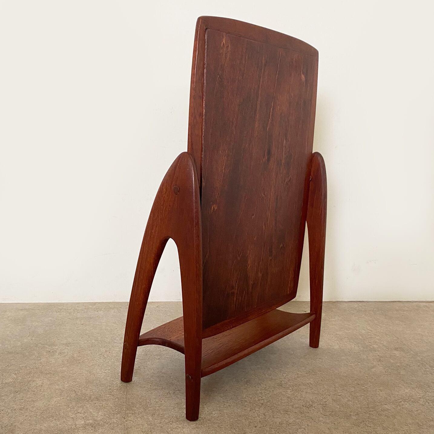 1960年代ごろスウェーデンの南部、スコーネ地方の街 Hässleholm で作られたテーブルミラー。チークの無垢材を削り出して作られた彫刻のような佇まいは、シンプルな造形でありながらチークの素材の表情を引き立て、どの方向から見ても優美なフォルムを楽しむことができます。小さな家具ですが細部に意匠を凝らした丁寧な作りで、実用的であるのはもちろんのことテーブルやチェストの上に置いて空間のアクセントとしても楽しめます。