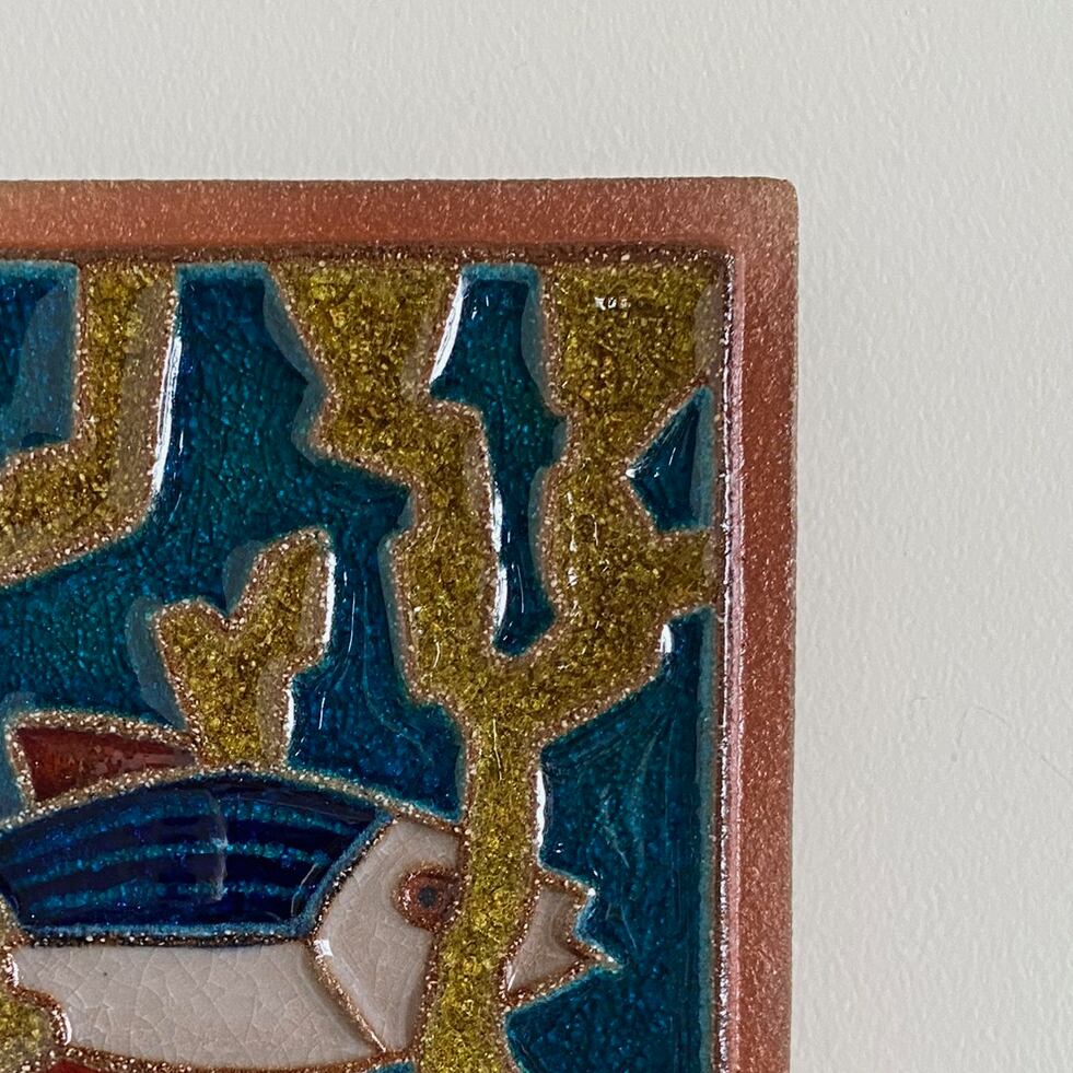 三匹の魚がサンゴの海を泳ぐ姿がのびやかに描かれたグラフィカルな1枚です。マットな陶器の質感と海を表現したブルーの釉薬の透明感が織りなすコントラストが、スーホルム独特の素朴な味わいに華やかさを添えています。