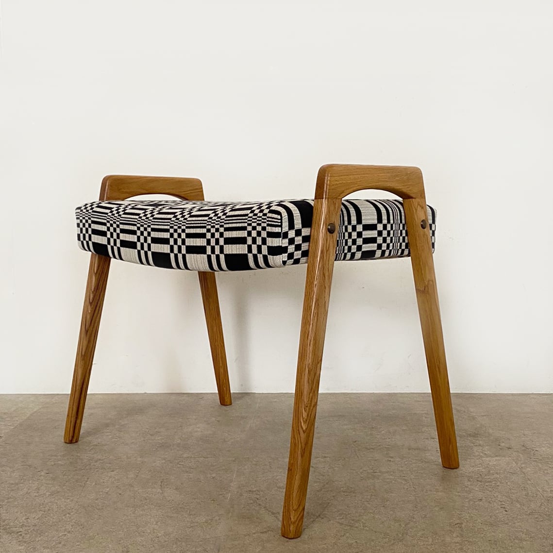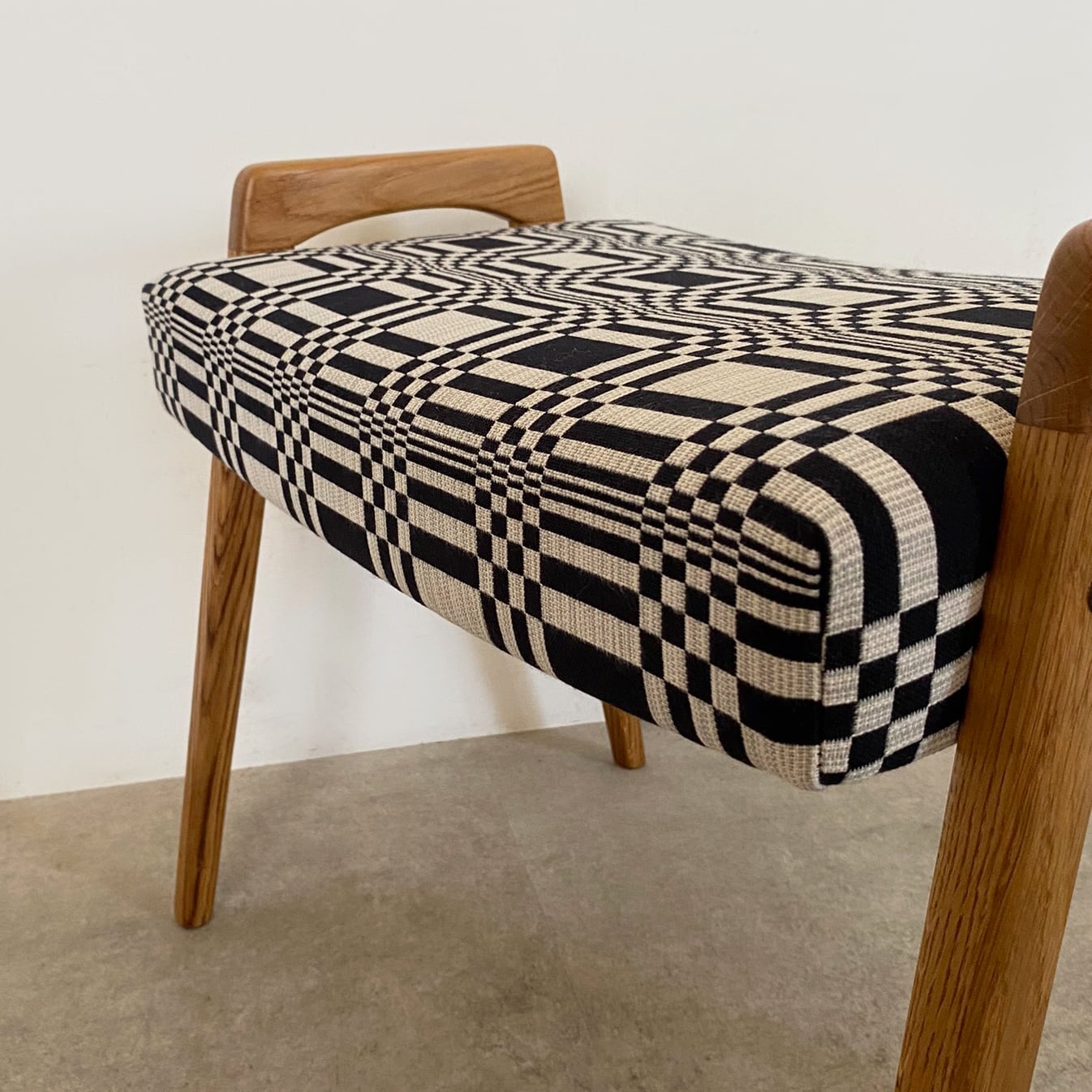 シートにはフィンランドを代表するテキスタイルブランド、ヨハンナ・グリクセン(Johanna Gullichsen)の代表的なデザイン、ドリス(Doris)を張り込みました。白とブラックのコントラストが織りなす立体感のあるグラフィカルなパターンが、オーク独特の力強い木目と調和し表情豊かに存在感のある一台にしています。