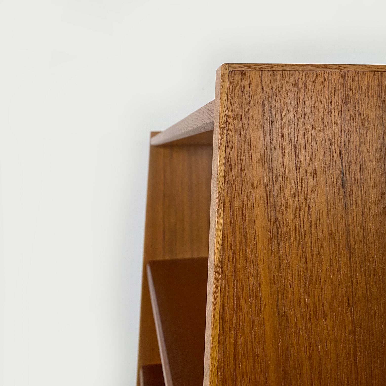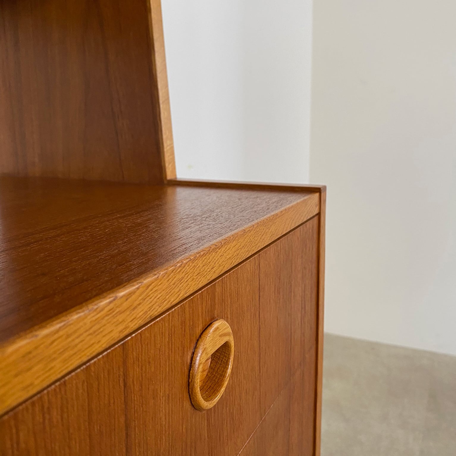 1960年代にスウェーデンで作られたオープンシェルフ。上段の棚板部分に背板がないので圧迫感がなく壁面が繋がるようにそのまま見えるので、自然に空間に馴染みます。またこのシェルフの魅力は、本体のチークとその小口部分を縁取るように使われているオークのバランスの美しさ。明るい色合いのオークが全体を軽やかに仕上げています。