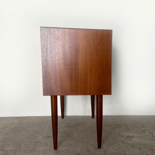 古い汚れや塗装を剥がした後に再塗装を施しました。引き出しの底板はオリジナルのままですが、クリーニングをしておりますので清潔にお使いいただけます。引出しの1段目、両サイドにある黒い点はシミではなく木目によるものです。経年により味わい深くなったヴィンテージのチークの色合いと、美しい艶を長く楽しんでいたける仕上がりになっております。詳しくは画像にてご確認ください。