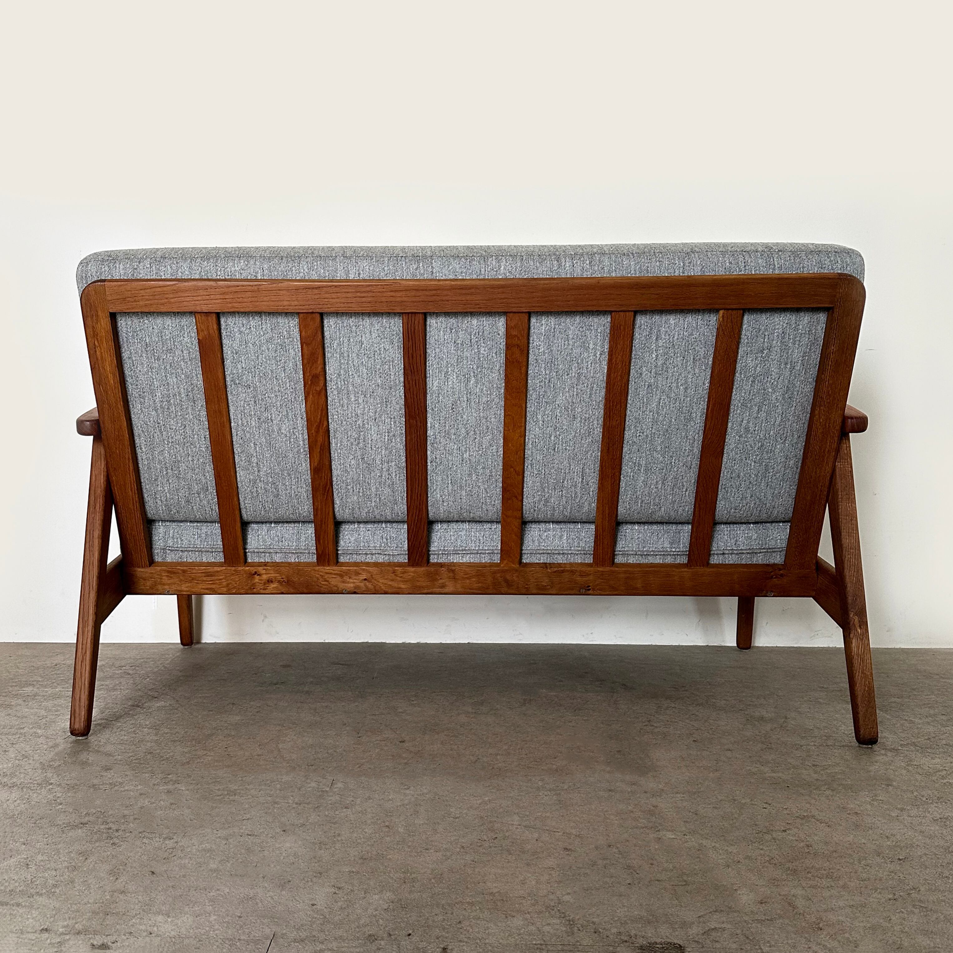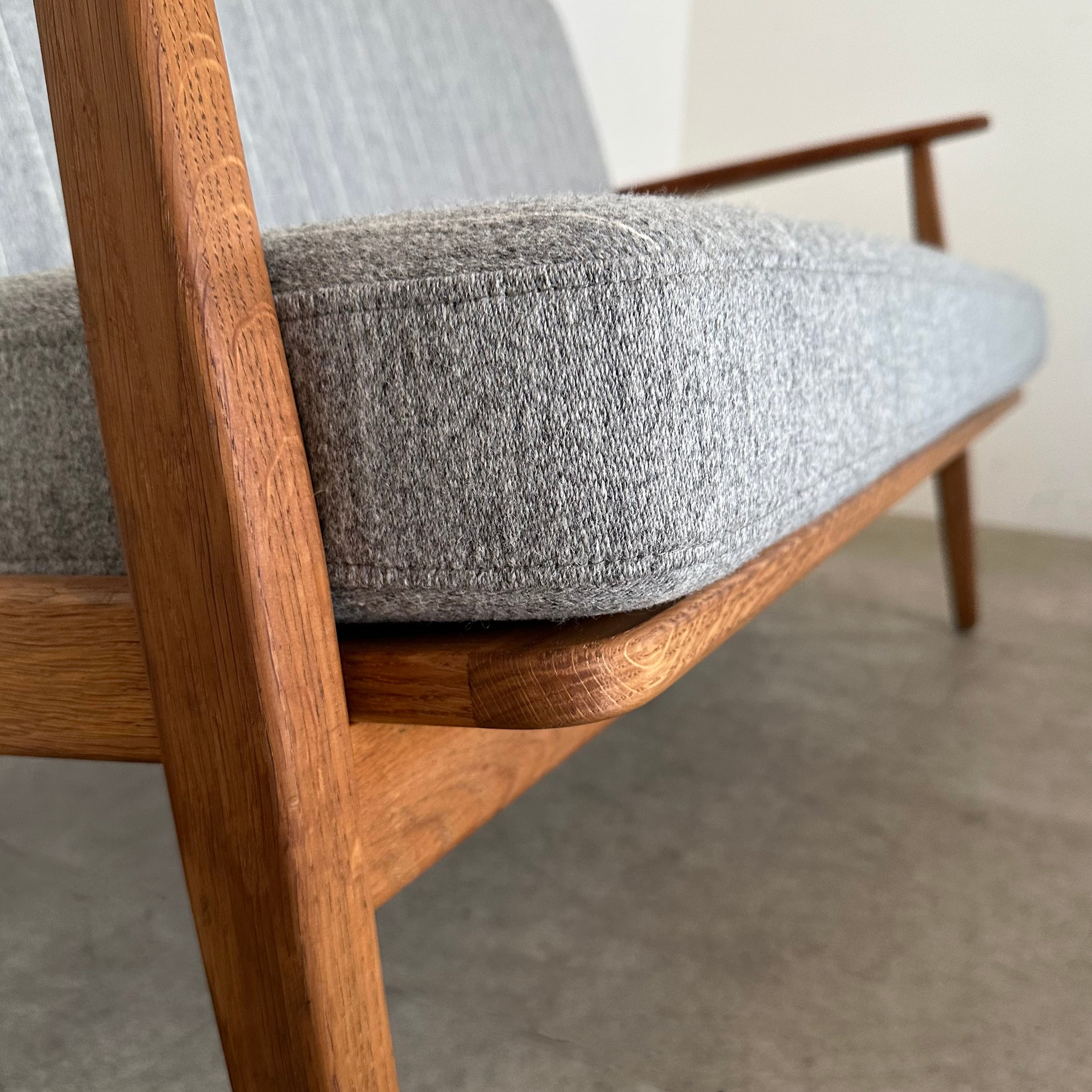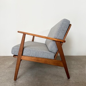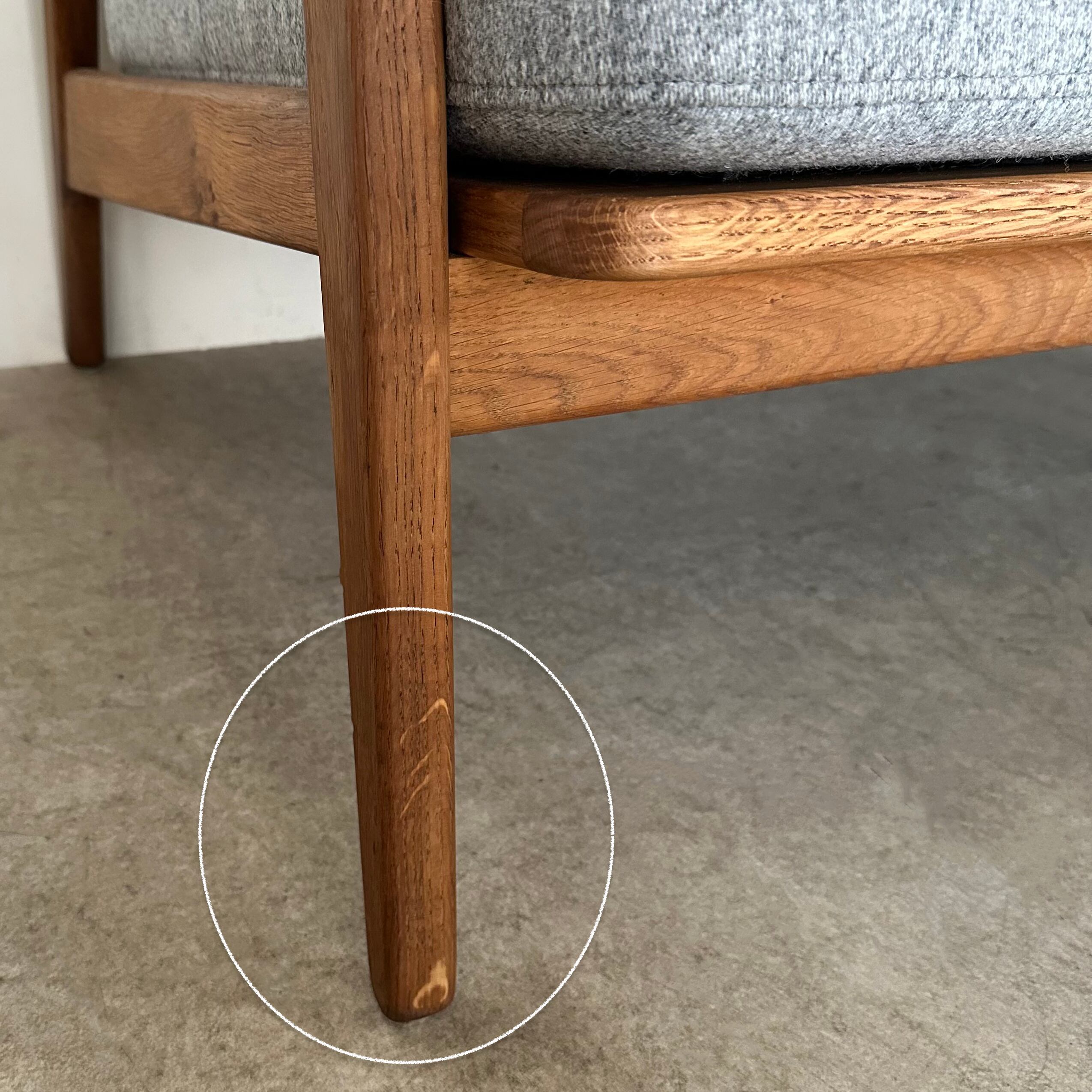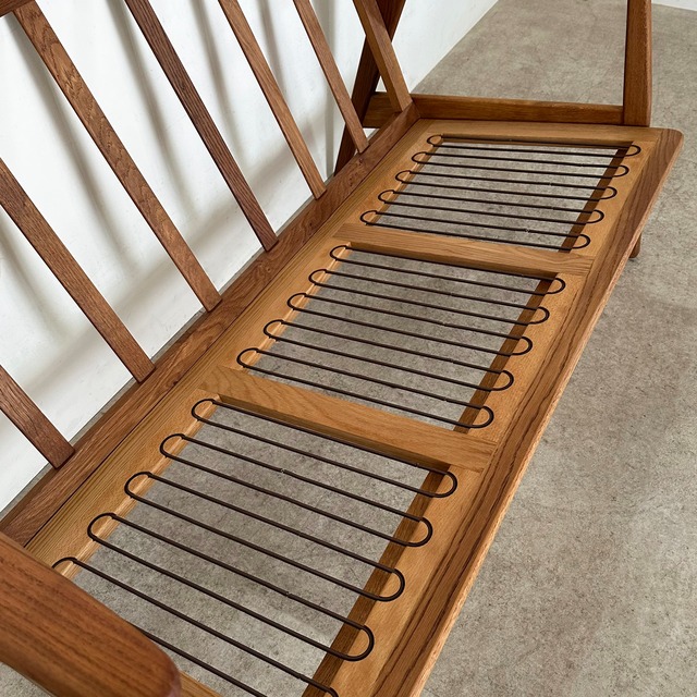 著名なデザイナーの作品ではありませんが、当時多く作られたアノニマスデザインの一つで、チークとオークのコンビネーション、縦格子状の背面のデザインなど、北欧ヴィンテージ家具の特徴と作りの良さが随所に見られるスタイルのソファです。なだらかに傾斜する座面も北欧ヴィンテージのソファの特徴の一つで、ゆったりとした掛け心地をもたらします。